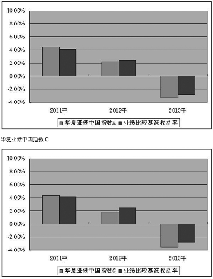 基金管理人:华夏基金管理有限公司 基金托管人:交通银行股份有限公司 报告送出日期:二〇一四年三月二十六日 §1 重要提示 基金管理人的董事会、董事保证本报告所载资料不存在虚假记载、误导性陈述或重大遗漏,并对其内容的真实性、准确性和完整性承担个别及连带的法律责任。本年度报告已经三分之二以上独立董事签字同意,并由董事长签发。 基金托管人交通银行股份有限公司根据本基金合同规定,于2014年3月24日复核了本报告中的财务指标、净值表现、利润分配情况、财务会计报告、投资组合报告等内容,保证复核内容不存在虚假记载、误导性陈述或者重大遗漏。 基金管理人承诺以诚实信用、勤勉尽责的原则管理和运用基金资产,但不保证基金一定盈利。 基金的过往业绩并不代表其未来表现。投资有风险,投资者在作出投资决策前应仔细阅读本基金的招募说明书及其更新。 本报告中的财务资料经审计,安永华明会计师事务所(特殊普通合伙)为本基金出具了无保留意见的审计报告,请投资者注意阅读。 本报告期自2013年1月1日起至12月31日止。 本年度报告摘要摘自年度报告正文,投资者欲了解详细内容,应阅读年度报告正文。 §2 基金简介 2.1 基金基本情况 ■ 2.2 基金产品说明 ■ 2.3 基金管理人和基金托管人 ■ 2.4 信息披露方式 ■ §3 主要财务指标、基金净值表现及利润分配情况 3.1 主要会计数据和财务指标 金额单位:人民币元 ■ 注:①所述基金业绩指标不包括持有人认购或交易基金的各项费用,计入费用后实际收益水平要低于所列数字。 ②本期已实现收益指基金本期利息收入、投资收益、其他收入(不含公允价值变动收益)扣除相关费用后的余额,本期利润为本期已实现收益加上本期公允价值变动收益。 3.2 基金净值表现 3.2.1 基金份额净值增长率及其与同期业绩比较基准收益率的比较 华夏亚债中国指数A: ■ 华夏亚债中国指数C: ■ 3.2.2 自基金合同生效以来基金份额累计净值增长率变动及其与同期业绩比较基准收益率变动的比较 亚债中国债券指数基金 份额累计净值增长率与业绩比较基准收益率历史走势对比图 (2011年5月25日至2013年12月31日) 华夏亚债中国指数A ■ 3.2.3 自基金合同生效以来基金每年净值增长率及其与同期业绩比较基准收益率的比较 亚债中国债券指数基金 自基金合同生效以来基金每年净值增长率及其与同期业绩比较基准收益率的对比图 华夏亚债中国指数A ■ 注:本基金合同于2011年5月25日生效,合同生效当年按实际存续期计算,不按整个自然年度进行折算。 3.3 自基金合同生效以来基金的利润分配情况 华夏亚债中国指数A: 单位:人民币元 ■ 华夏亚债中国指数C: 单位:人民币元 ■ §4 管理人报告 4.1 基金管理人及基金经理情况 4.1.1 基金管理人及其管理基金的经验 华夏基金管理有限公司成立于1998年4月9日,是经中国证监会批准成立的首批全国性基金管理公司之一。公司总部设在北京,在北京、上海、深圳、成都、南京、杭州、广州和青岛设有分公司,在香港及深圳设有子公司。公司是首批全国社保基金管理人、首批企业年金基金管理人、境内首批QDII基金管理人、境内首只ETF基金管理人,以及特定客户资产管理人、保险资金投资管理人,香港子公司是首批RQFII基金管理人。华夏基金是业务领域最广泛的基金管理公司之一。 2013年,华夏基金继续坚持以深入的投资研究为基础,高度重视风险管理,同时积极把握投资机会,旗下主动管理的股票和混合型基金业绩稳健,短期理财及货币型基金表现持续良好。根据银河证券基金研究中心基金业绩统计报告,在基金分类排名中(截至2013年12月31日数据),华夏稳增混合今年以来的净值增长率在12只灵活配置型混合基金(股票上限95%)中排名第1;华夏成长混合今年以来的净值增长率在29只偏股型混合基金(股票上限80%)中排名第6;华夏经典混合今年以来的净值增长率在71只灵活配置型混合基金(股票上限80%)中排名第5。 凭借规范的经营管理及良好的品牌声誉,2013年华夏基金荣获多家机构评选的多个奖项,主要奖项包括:在《证券时报》主办的“2012年度中国基金业明星基金奖”的评选中,华夏基金荣获“五年持续回报明星基金公司奖”,所管理的基金荣获4个单项奖;在《上海证券报》主办的第十届中国“金基金”奖的评选中,华夏基金荣获“金基金十年·卓越公司奖”;在《中国证券报》主办的“第十届中国基金业金牛奖”的评选中,华夏基金荣获“被动投资金牛基金公司奖”,所管理的基金荣获5个单项奖;在晨星(中国)举办的“晨星(中国)2013年度基金奖”评选中,华夏回报混合荣获“混合型基金奖”。 在客户服务方面,2013年,华夏基金继续以客户需求为导向,努力提高客户的交易便利性:(1)推出了货币基金的“还贷款”及信用卡还款业务,方便投资者进行现金管理;(2)直销网上交易新增了中国建设银行储蓄卡的“快易付”功能,并增加多家银行卡的电子交易业务,提高投资者的交易效率;(3)开通了华夏基金微信公众服务平台并推出微信交易功能,在淘宝网、天天基金网等平台开通基金业务,并与百度达成互联网业务合作,为投资者提供更多交易渠道。 4.1.2 基金经理(或基金经理小组)及基金经理助理简介 ■ 注:①上述任职日期、离任日期根据本基金管理人对外披露的任免日期填写。 ②证券从业的含