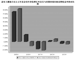 基金管理人:嘉实基金管理有限公司 基金托管人:中国银行股份有限公司 送出日期:2014年3月26日 §1 重要提示 基金管理人的董事会、董事保证本报告所载资料不存在虚假记载、误导性陈述或重大遗漏,并对其内容的真实性、准确性和完整性承担个别及连带的法律责任。本年度报告已经全部独立董事签字同意,并由董事长签发。 基金托管人中国银行股份有限公司根据本基金合同规定,于2014年3月20日复核了本报告中的财务指标、净值表现、利润分配情况、财务会计报告、投资组合报告等内容,保证复核内容不存在虚假记载、误导性陈述或者重大遗漏。 基金管理人承诺以诚实信用、勤勉尽责的原则管理和运用基金资产,但不保证基金一定盈利。 基金的过往业绩并不代表其未来表现。投资有风险,投资者在作出投资决策前应仔细阅读本基金的招募说明书及其更新。 本报告期自2013年1月1日起至2013年12月31日止。 本年度报告摘要摘自年度报告正文,投资者欲了解详细内容,应阅读年度报告正文。 §2 基金简介 2.1 基金基本情况 ■ 2.2 基金产品说明 ■ 2.3 基金管理人和基金托管人 ■ 2.4 信息披露方式 ■ §3 主要财务指标、基金净值表现及利润分配情况 3.1 主要会计数据和财务指标 金额单位:人民币元 ■ 注:(1)本期已实现收益指基金本期利息收入、投资收益、其他收入(不含公允价值变动收益)扣除相关费用后的余额,本期利润为本期已实现收益加上本期公允价值变动收益;(2)所述基金业绩指标不包括持有人认购或交易基金的各项费用,计入费用后实际收益水平要低于所列数字;(3)期末可供分配利润采用期末资产负债表中未分配利润与未分配利润中已实现部分的孰低数。 3.2 基金净值表现 3.2.1 基金份额净值增长率及其与同期业绩比较基准收益率的比较 ■ 注:本基金业绩比较基准为:沪深300指数增长率×95%+同业存款收益率×5%。 本基金的业绩基准指数按照构建公式每交易日进行计算,计算方式如下: Benchmark(0)=1000 Return(t)=95%×(沪深300指数(t)/沪深300指数(t-1)-1)+5%×同业存款日收益率 Benchmark(t)=(1+Return (t))×Benchmark (t-1) 其中t=1,2,3,…。 3.2.2 自基金合同生效以来基金份额累计净值增长率变动及其与同期业绩比较基准收益率变动的比较 ■ 图:嘉实主题混合基金份额累计净值增长率与同期业绩比较基准收益率的历史走势对比图 (2006年7月21日至2013年12月31日) 注1:按基金合同约定,本基金自基金合同生效日起6个月内为建仓期。建仓期结束时本基金的各项投资比例符合基金合同第十四条((二)投资范围、(八)2.投资组合比例限制)约定:(1)资产配置范围为:股票资产30%~95%,债券0~70%,权证0~3%,现金或者到期日在一年以内的政府债券不低于基金资产净值的5%;(2)持有一家上市公司的股票,其市值不超过基金资产净值的10%;(3)本基金与基金管理人管理的其他基金持有一家公司发行的证券总和,不超过该证券的10%;(4)在任何交易日买入权证的总金额,不超过上一交易日基金资产净值的千分之五;(5)持有的全部权证,其市值不超过基金资产净值的3%;(6)法律法规和基金合同规定的其他限制。 注2:2013年10月29日,本基金管理人发布《关于嘉实主题混合基金经理变更的公告》,马惠明先生不再担任本基金基金经理;聘请邹唯先生担任本基金基金经理职务。 3.2.3 过去五年基金每年净值增长率及其与同期业绩比较基准收益率的比较 ■ 3.3 过去三年基金的利润分配情况 单位:人民币元 ■ §4 管理人报告 4.1 基金管理人及基金经理情况 4.1.1 基金管理人及其管理基金的经验 本基金管理人为嘉实基金管理有限公司,成立于1999年3月25日,是经中国证监会批准设立的第一批基金管理公司之一,是中外合资基金管理公司。公司注册地在上海,总部设在北京并设深圳、成都、杭州、青岛、南京、福州、广州分公司。公司获得首批全国社保基金、企业年金投资管理人和QDII、特定资产管理业务资格。 截止2013年12月31日,基金管理人共管理2只封闭式证券投资基金、54只开放式证券投资基金,具体包括嘉实泰和封闭、嘉实丰和价值封闭、嘉实成长收益混合、嘉实增长混合、嘉实稳健混合、嘉实债券、嘉实服务增值行业混合、嘉实优质企业股票、嘉实货币、嘉实沪深300ETF联接(LOF)、嘉实超短债债券、嘉实主题混合、嘉实策略混合、嘉实海外中国股票(QDII)、嘉实研究精选股票、嘉实多元债券、嘉实量化阿尔法股票、嘉实回报混合、嘉实基本面50指数(LOF)、嘉实价值优势股票、嘉实稳固收益债券、嘉实H股指数(QDII-LOF)、嘉实主题新动力股票、嘉实多利分级债券、嘉实领先成长股票、嘉实深证基本面120ETF、嘉实深证基本面120ETF联接、嘉实黄金(QDII-FOF-LOF)、嘉实信用债券、嘉实周期优选股票、嘉实安心货币、嘉实中创400ETF、嘉实中创400ETF联接、嘉实沪深300ETF、嘉实优化红利股票、嘉实全球房地产(QDII)、嘉实理财宝7天债券、嘉实增强收益定期债券、嘉实纯债债券、嘉实中证中期企业债指数(LOF)、嘉实中证500ETF、嘉实增强信用定期债券、嘉实中证500ETF联接、嘉实中证中期国债ETF、嘉实中证金边中期国债ETF联接、嘉实丰益纯债定期债券、嘉实研究阿尔法股票、嘉实如意宝定期债券、嘉实美国成长股票(QDII)、嘉实丰益策略定期债券、嘉实丰益信用定期债券、嘉实新兴市场双币分级债券、嘉实绝对收益策略定期混合、嘉实宝A/B、