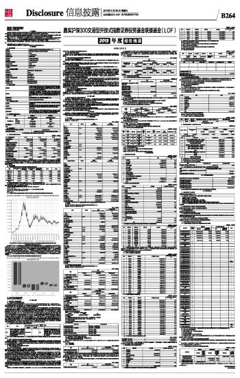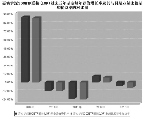 l基金管理人:嘉实基金管理有限公司 基金托管人:中国银行股份有限公司 送出日期:2014年3月26日 §1 重要提示 基金管理人的董事会、董事保证本报告所载资料不存在虚假记载、误导性陈述或重大遗漏,并对其内容的真实性、准确性和完整性承担个别及连带的法律责任。本年度报告已经全部独立董事签字同意,并由董事长签发。 基金托管人中国银行股份有限公司根据本基金合同规定,于2014年3月20日复核了本报告中的财务指标、净值表现、利润分配情况、财务会计报告、投资组合报告等内容,保证复核内容不存在虚假记载、误导性陈述或者重大遗漏。 根据2012 年8 月21 日中国证监会《关于核准嘉实沪深300 指数证券投资基金(LOF)基金份额持有人大会决议的批复》(证监许可[2012]1146 号),变更了投资范围并更名为嘉实沪深300交易型开放式指数证券投资基金联接基金(LOF)。 基金管理人承诺以诚实信用、勤勉尽责的原则管理和运用基金资产,但不保证基金一定盈利。 基金的过往业绩并不代表其未来表现。投资有风险,投资者在作出投资决策前应仔细阅读本基金的招募说明书及其更新。 本报告期自2013年1月1日起至2013年12月31日止。 本年度报告摘要摘自年度报告正文,投资者欲了解详细内容,应阅读年度报告正文。 §2 基金简介 2.1 基金基本情况 ■ 2.1.1 目标基金基本情况 ■ 2.2 基金产品说明 ■ 2.2.1 目标基金产品说明 ■ 2.3 基金管理人和基金托管人 ■ 2.4 信息披露方式 ■ §3 主要财务指标、基金净值表现及利润分配情况 3.1 主要会计数据和财务指标 金额单位:人民币元 ■ 注:(1)本期已实现收益指基金本期利息收入、投资收益、其他收入(不含公允价值变动收益)扣除相关费用后的余额,本期利润为本期已实现收益加上本期公允价值变动收益;(2)所述基金业绩指标不包括持有人认购或交易基金的各项费用,计入费用后实际收益水平要低于所列数字;(3)期末可供分配利润采用期末资产负债表中未分配利润与未分配利润中已实现部分的孰低数。 3.2 基金净值表现 3.2.1 基金份额净值增长率及其与同期业绩比较基准收益率的比较 ■ 注:本基金业绩比较基准为:沪深300指数增长率×95% +银行同业存款收益率×5%。 本基金原则上将不低于90%的基金资产净值投资于沪深300指数成份股和备选成份股,选用以上业绩衡量基准可以有效评估本基金投资组合业绩,反映本基金的风格特点。 本基金的业绩基准指数按照构建公式每交易日进行计算,计算方式如下: Benchmark(0)=1000 Return(t)=95%×(沪深300指数 (t)/沪深300指数(t-1) -1)+5%×同业存款日收益率 Benchmark(t)=(1+Return (t))×Benchmark (t-1) 其中t=1,2,3,…。 3.2.2 自基金合同生效以来基金份额累计净值增长率变动及其与同期业绩比较基准收益率变动的比较 ■ 图:嘉实沪深300ETF联接(LOF)基金份额累计净值增长率与同期业绩比较基准收益率的历史走势对比图 (2005年8月29日至2013年12月31日) 注:根据2012年8月21日中国证监会《关于核准嘉实沪深300指数证券投资基金(LOF)基金份额持有人大会决议的批复》(证监许可[2012]1146号),变更了投资范围并更名为嘉实沪深300交易型开放式指数证券投资基金联接基金(LOF)。本基金自2012年8月21日起 3个月内为建仓期(原持有的沪深300指数成份股、备选成份股调整为嘉实沪深300ETF),建仓期结束时本基金的各项投资比例符合基金合同第十七条((二)投资范围和(七)投资禁止行为与限制)的规定:(1)基金财产参与股票发行申购,所申报的金额不得超过本基金的总资产,所申报的股票数量不得超过拟发行股票公司本次发行股票的总量;(2)本基金投资于目标ETF的资产比例不低于基金资产净值的90%(已申购但尚未确认的目标ETF份额可计入在内),持有现金或到期日在一年以内的政府债券的比例不低于基金资产净值的5%。(3)法律法规或监管部门对上述比例限制另有规定的,从其规定。 3.2.3 过去五年基金每年净值增长率及其与同期业绩比较基准收益率的比较 ■ 3.3 过去三年基金的利润分配情况 过去三年本基金未实施利润分配。 §4 管理人报告 4.1 基金管理人及基金经理情况 4.1.1 基金管理人及其管理基金的经验 本基金管理人为嘉实基金管理有限公司,成立于1999年3月25日,是经中国证监会批准设立的第一批基金管理公司之一,是中外合资基金管理公司。公司注册地在上海,总部设在北京并设深圳、成都、杭州、青岛、南京、福州、广州分公司。公司获得首批全国社保基金、企业年金投资管理人和QDII、特定资产管理业务资格。 截止2013年12月31日,基金管理人共管理2只封闭式证券投资基金、54只开放式证券投资基金,具体包括嘉实泰和封闭、嘉实丰和价值封闭、嘉实成长收益混合、嘉实增长混合、嘉实稳健混合、嘉实债券、嘉实服务增值行业混合、嘉实优质企业股票、嘉实货币、嘉实沪深300ETF联接(LOF)、嘉实超短债债券、嘉实主题混合、嘉实策略混合、嘉实海外中国股票(QDII)、嘉实研究精选股票、嘉实多元债券、嘉实量化阿尔法股票、嘉实回报混合、嘉实基本面50指数(LOF)、嘉实价值优势股票、嘉实稳固收益债券、嘉实H股指数(QDII-LOF)、嘉实主题新动力股票、嘉实多利分级债券、嘉实领先成长股票、嘉实深证基本面120ETF、嘉实深证基本面120ETF联接、嘉实黄金(QDII-FOF-LOF)、嘉实信用债券、嘉实周期优选股票、嘉实安心货币、嘉实中创400ETF、