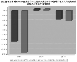 基金管理人:嘉实基金管理有限公司 基金托管人:中国银行股份有限公司 送出日期:2014年3月26日 §1 重要提示 基金管理人的董事会、董事保证本报告所载资料不存在虚假记载、误导性陈述或重大遗漏,并对其内容的真实性、准确性和完整性承担个别及连带的法律责任。本年度报告已经全部独立董事签字同意,并由董事长签发。 基金托管人中国银行股份有限公司根据本基金合同规定,于2014年3月20日复核了本报告中的财务指标、净值表现、利润分配情况、财务会计报告、投资组合报告等内容,保证复核内容不存在虚假记载、误导性陈述或者重大遗漏。 基金管理人承诺以诚实信用、勤勉尽责的原则管理和运用基金资产,但不保证基金一定盈利。 基金的过往业绩并不代表其未来表现。投资有风险,投资者在作出投资决策前应仔细阅读本基金的招募说明书及其更新。 本报告期自2013年1月1日起至2013年12月31日止。 本年度报告摘要摘自年度报告正文,投资者欲了解详细内容,应阅读年度报告正文。 §2 基金简介 2.1 基金基本情况 ■ 2.2 基金产品说明 ■ 2.3 基金管理人和基金托管人 ■ 2.4 信息披露方式 ■ §3 主要财务指标、基金净值表现及利润分配情况 3.1 主要会计数据和财务指标 金额单位:人民币元 ■ 注:(1)本期已实现收益指基金本期利息收入、投资收益、其他收入(不含公允价值变动收益)扣除相关费用后的余额,本期利润为本期已实现收益加上本期公允价值变动收益;(2)所述基金业绩指标不包括持有人认购或交易基金的各项费用,计入费用后实际收益水平要低于所列数字;(3)期末可供分配利润采用期末资产负债表中未分配利润与未分配利润中已实现部分的孰低数。 3.2 基金净值表现 3.2.1 基金份额净值增长率及其与同期业绩比较基准收益率的比较 ■ 3.2.2 自基金合同生效以来基金份额累计净值增长率变动及其与同期业绩比较基准收益率变动的比较 ■ 图:嘉实深证基本面120ETF基金份额累计净值增长率与同期业绩比较基准收益率的历史走势对比图 (2011年8月1日至2013年12月31日) 注:按基金合同和招募说明书的约定,本基金自基金合同生效日起3个月内为建仓期,建仓期结束时本基金的各项投资比例符合基金合同“十五、基金的投资(二)投资范围和(八)2、基金投资组合比例限制”的有关约定。 3.2.3 自基金合同生效以来基金每年净值增长率及其与同期业绩比较基准收益率的比较 ■ 注:本基金基金合同生效日为2011年8月1日,2011年度的相关数据根据当年实际存续期(2011年8月1日至2011年12月31日)计算。 3.3 过去三年基金的利润分配情况 本基金自基金合同生效以来未实施利润分配。 §4 管理人报告 4.1 基金管理人及基金经理情况 4.1.1 基金管理人及其管理基金的经验 本基金管理人为嘉实基金管理有限公司,成立于1999年3月25日,是经中国证监会批准设立的第一批基金管理公司之一,是中外合资基金管理公司。公司注册地在上海,总部设在北京并设深圳、成都、杭州、青岛、南京、福州、广州分公司。公司获得首批全国社保基金、企业年金投资管理人和QDII、特定资产管理业务资格。 截止2013年12月31日,基金管理人共管理2只封闭式证券投资基金、54只开放式证券投资基金,具体包括嘉实泰和封闭、嘉实丰和价值封闭、嘉实成长收益混合、嘉实增长混合、嘉实稳健混合、嘉实债券、嘉实服务增值行业混合、嘉实优质企业股票、嘉实货币、嘉实沪深300ETF联接(LOF)、嘉实超短债债券、嘉实主题混合、嘉实策略混合、嘉实海外中国股票(QDII)、嘉实研究精选股票、嘉实多元债券、嘉实量化阿尔法股票、嘉实回报混合、嘉实基本面50指数(LOF)、嘉实价值优势股票、嘉实稳固收益债券、嘉实H股指数(QDII-LOF)、嘉实主题新动力股票、嘉实多利分级债券、嘉实领先成长股票、嘉实深证基本面120ETF、嘉实深证基本面120ETF联接、嘉实黄金(QDII-FOF-LOF)、嘉实信用债券、嘉实周期优选股票、嘉实安心货币、嘉实中创400ETF、嘉实中创400ETF联接、嘉实沪深300ETF、嘉实优化红利股票、嘉实全球房地产(QDII)、嘉实理财宝7天债券、嘉实增强收益定期债券、嘉实纯债债券、嘉实中证中期企业债指数(LOF)、嘉实中证500ETF、嘉实增强信用定期债券、嘉实中证500ETF联接、嘉实中证中期国债ETF、嘉实中证金边中期国债ETF联接、嘉实丰益纯债定期债券、嘉实研究阿尔法股票、嘉实如意宝定期债券、嘉实美国成长股票(QDII)、嘉实丰益策略定期债券、嘉实丰益信用定期债券、嘉实新兴市场双币分级债券、嘉实绝对收益策略定期混合、嘉实宝A/B、嘉实活期宝货币、嘉实1个月理财债券。其中嘉实增长混合、嘉实稳健混合、嘉实债券属于嘉实理财通系列基金,同时,管理多个全国社保基金、企业年金、特定客户资产投资组合。 4.1.2 基金经理(或基金经理小组)及基金经理助理简介 ■ 注:(1)任职日期是指本基金合同生效之日;(2)证券从业的含义遵从行业协会《证券业从业人员资格管理办法》的相关规定;(3)2014年3月11日,本基金管理人发布《关于嘉实深证基本面120ETF基金经理变更的公告》,杨阳先生不再担任本基金基金经理,聘请杨宇先生担任本基金基金经理职务。 4.2 管理人对报告期内本基金运作遵规守信情况的说明 报告期内,本基金管理人严格遵循了《证券法》、《证券投资基金法》及其各项配套法规、《深证