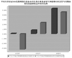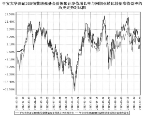基金管理人:平安大华基金管理有限公司 基金托管人:中国银行股份有限公司 送出日期:2014年3月28日 §1 重要提示 1.1 重要提示 基金管理人的董事会、董事保证本报告所载资料不存在虚假记载、误导性陈述或重大遗漏,并对其内容的真实性、准确性和完整性承担个别及连带的法律责任。本年度报告已经全部独立董事签字同意,并由董事长签发。 基金托管人中国银行股份有限公司根据本基金合同规定,于2014年3月27日复核了本报告中的财务指标、净值表现、利润分配情况、财务会计报告、投资组合报告等内容,保证复核内容不存在虚假记载、误导性陈述或者重大遗漏。 基金管理人承诺以诚实信用、勤勉尽责的原则管理和运用基金资产,但不保证基金一定盈利。 基金的过往业绩并不代表其未来表现。投资有风险,投资者在作出投资决策前应仔细阅读本基金的招募说明书及其更新。 本报告期自2013年1月1日起至12月31日止。 §2 基金简介 2.1 基金基本情况 ■ 2.2 基金产品说明 ■ 2.3 基金管理人和基金托管人 ■ 2.4信息披露方式 ■ §3 主要财务指标、基金净值表现及利润分配情况 3.1 主要会计数据和财务指标 金额单位:人民币元 ■ 注:1、本期已实现收益指基金本期利息收入、投资收益、其他收入(不含公允价值变动收益)扣除相关费用后的余额,本期利润为本期已实现收益加上本期公允价值变动收益; 2、期末可供分配利润是采用期末资产负债表未分配利润与未分配利润中已实现部分的孰低数; 3、上述基金业绩指标不包括持有人认购或交易基金的各项费用,计入费用后实际收益水平要低于所列数字。 3.2 基金净值表现 3.2.1 基金份额净值增长率及其与同期业绩比较基准收益率的比较 ■ 注:业绩比较基准:深证300指数收益率×95%+商业银行活期存款利率(税后)×5% 3.2.2 自基金合同生效以来基金份额累计净值增长率变动及其与同期业绩比较基准收益率变动的比较 ■ 1、本基金基金合同于2011年12月20日正式生效,截至报告期末已满二年; 2、按照本基金的基金合同规定,基金管理人应当自基金合同生效之日起六个月内使基金的投资组合比例符合基金合同的约定,截至报告期末本基金已完成建仓,建仓期结束时各项资产配置比例符合合同约定. 3.2.3 自基金合同生效以来基金每年净值增长率及其与同期业绩比较基准收益率的比较 ■ 1.本基金合同于2011年12月20日正式生效, 截止报告期末已满二年. 2.2011年是合同生效当年, 按实际续存期计算, 不按整个自然年度进行折算. 3.3 过去三年基金的利润分配情况 单位:人民币元 ■ §4 管理人报告 4.1 基金管理人及基金经理情况 4.1.1 基金管理人及其管理基金的经验 平安大华基金管理有限公司(以下简称"平安基金")经中国证监会证监许可【2010】1917号文批准设立。平安基金总部位于深圳,注册资本金为3亿元人民币,是目前中国内地基金业注册资本金最高的基金公司之一。目前公司股东为平安信托有限责任公司,持有股权60.7%;新加坡大华资产管理有限公司,持有股权25%;三亚盈湾旅业有限公司,持有股权14.3%。 平安基金秉承“规范、诚信、专业、创新”企业管理理念,致力于通过持续稳定的投资业绩,不断丰富的客户服务手段及服务内容,为投资人提供多样化的基金产品和高品质的理财服务,从而实现“以专业承载信赖”的品牌承诺,成为深得投资人信赖的基金管理公司。截至2013年12月31日,平安基金共管理六只开放式基金。 4.1.2 基金经理(或基金经理小组)及基金经理助理简介 ■ 1、此处的“任职日期”为基金合同生效之日,“离任日期”为公告确定的解聘日期。 2、证券从业的含义遵从行业协会《证券业从业人员资格管理办法》的相关规定。 4.2 管理人对报告期内本基金运作遵规守信情况的说明 本报告期内,本基金管理人严格遵守《中华人民共和国证券投资基金法》、《证券投资基金运作管理办法》、《证券投资基金销售管理办法》和《证券投资基金信息披露管理办法》等有关法律法规及各项实施准则、《平安大华深证300指数增强型证券投资基金基金合同》和其他有关法律法规的规定,本着诚实信用、勤勉尽责的原则管理和运用基金资产,在严格控制风险的基础上,为基金份额持有人谋求最大利益。本报告期内,基金运作整体合法合规,没有损害基金份额持有人利益。基金的投资范围、投资比例及投资组合符合有关法律法规及基金合同的规定。 4.3 管理人对报告期内公平交易情况的专项说明 4.3.1 公平交易制度和控制方法 本报告期内,根据《证券投资基金管理公司公平交易制度指导意见》,本基金管理人制定并下发了《平安大华基金管理有限责任公司公平交易管理制度》、《平安大华基金管理有限责任公司异常交易监控及报告制度》,严格执行法律法规及制度要求,从以下五个方面对交易行为进行严格控制:一是搭建平等的投资信息平台,合理设置各类资产管理业务之间以及各类资产管理业务内部的组织结构,在保证各投资组合投资决策相对独立性的同时,确保其在获得投资信息、投资建议和实施投资决策等方面享有公平的机会。二是制定公平交易规则,建立科学的投资决策体系,加强交易执行环节的内部控制,并通过工作制度、流程和技术手段保证公平交易原则的实现。三是加强对投资交易行为的监察稽核力度,建立有效的异常交
