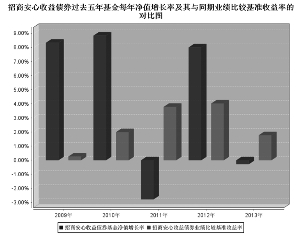 基金管理人:招商基金管理有限公司 基金托管人:中国工商银行股份有限公司 送出日期:2014年3月28日 §1 重要提示 基金管理人的董事会、董事保证本报告所载资料不存在虚假记载、误导性陈述或重大遗漏,并对其内容的真实性、准确性和完整性承担个别及连带的法律责任。本年度报告已经三分之二以上独立董事签字同意,并由董事长签发。 基金托管人中国工商银行股份有限公司根据本基金合同规定,于2014年3月26日复核了本报告中的财务指标、净值表现、利润分配情况、财务会计报告、投资组合报告等内容,保证复核内容不存在虚假记载、误导性陈述或者重大遗漏。 基金管理人承诺以诚实信用、勤勉尽责的原则管理和运用基金资产,但不保证基金一定盈利。 基金的过往业绩并不代表其未来表现。投资有风险,投资者在作出投资决策前应仔细阅读本基金的招募说明书及其更新。 本年度报告摘要摘自年度报告正文,投资者欲了解详细内容,应阅读年度报告正文。 本报告财务资料已经审计,德勤华永会计师事务所(特殊普通合伙)为本基金出具了2013年度无保留意见的审计报告,请投资者注意阅读。 本报告期自2013年1月1日起至12月31日止。 §2 基金简介 2.1 基金基本情况 ■ 2.2 基金产品说明 ■ 2.3 基金管理人和基金托管人 ■ 2.4 信息披露方式 ■ §3 主要财务指标、基金净值表现及利润分配情况 3.1 主要会计数据和财务指标 金额单位:人民币元 ■ 注:1、 基金业绩指标不包括持有人认(申)购或交易基金的各项费用,计入费用后实际收益水平要低于所列数字; 2、本期已实现收益指基金本期利息收入、投资收益、其他收入(不含公允价值变动收益)扣除相关费用后的余额,本期利润为本期已实现收益加上本期公允价值变动收益; 3、期末可供分配利润,采用期末资产负债表中未分配利润与未分配利润中已实现部分的孰低数。 3.2 基金净值表现 3.2.1 基金份额净值增长率及其与同期业绩比较基准收益率的比较 ■ 注:业绩比较基准收益率为中信标普全债指数。 3.2.2 自基金合同生效以来基金份额累计净值增长率变动及其与同期业绩比较基准收益率变动的比较 ■ 注:根据基金合同的规定:本基金对债券等固定收益类品种的投资比例不低于基金资产的80% (其中,企业债投资比例为0-40%,可转债投资比例为0-40%),股票等权益类品种的投资比例不高于基金资产的20%,现金或到期日在一年以内的政府债券不低于5%。本基金的建仓期为2008年10月22日至2009年4月21日,截至建仓期结束时(2009年4月21日)各项资产配置比例均符合基金合同的规定。 3.2.3 过去五年基金每年净值增长率及其与同期业绩比较基准收益率的比较 ■ 3.3 过去三年基金的利润分配情况 单位:人民币元 ■ §4 管理人报告 4.1 基金管理人及基金经理情况 4.1.1 基金管理人及其管理基金的经验 招商基金管理有限公司于2002年12月27日经中国证监会(2002)100号文批准设立,是中国第一家中外合资基金管理公司。公司的经营范围包括发起设立基金、基金管理业务和中国证监会批准的其它业务。 经招商基金管理有限公司(以下简称“本公司”)股东会审议通过,并经中国证券监督管理委员会证监许可[2013]1074号文批复同意,本公司原股东荷兰投资公司(ING Asset Management B.V.)将其持有的本公司21.6%股权转让给招商银行股份有限公司、11.7%股权转让给招商证券股份有限公司,截止2013年10月份,本次股权转让的相关工商变更登记手续已办理完毕。 目前,本公司的股东股权结构为:招商银行股份有限公司持有公司全部股权的55%,招商证券股份有限公司持有公司全部股权的45%。公司注册资本金为2.1亿元人民币。招商基金拥有两家全资子公司,分别为招商财富资产管理有限公司和招商资产管理(香港)有限公司。 截至2013年12月31日,本基金管理人共管理三十五只共同基金,具体如下:从2003年4月28日起管理招商安泰系列开放式证券投资基金(含招商安泰股票证券投资基金、招商安泰平衡型证券投资基金、招商安泰债券投资基金);从2004年1月14日起管理招商现金增值开放式证券投资基金;从2004年6月1日起开始管理招商先锋证券投资基金;从2005年11月17日起开始管理招商优质成长股票型证券投资基金(LOF);从2006年7月11日起开始管理招商安本增利债券型证券投资基金;从2007年3月30日起开始管理招商核心价值混合型证券投资基金;从2008年6月19日起开始管理招商大盘蓝筹股票型证券投资基金;从2008年10月22日起开始管理招商安心收益债券型证券投资基金;从2009年6月19日起开始管理招商行业领先股票型证券投资基金;从2009年12月25日起开始管理招商中小盘精选股票型证券投资基金;从2010年3月25日起开始管理招商全球资源股票型证券投资基金(QDII);从2010年6月22日起开始管理招商深证100指数证券投资基金;从2010年6月25日起开始管理招商信用添利债券型证券投资基金;从2010年12月8日开始管理上证消费80交易型开放式指数证券投资基金及招商上证消费80交易型开放式指数证券投资基金联接基金;从2011年2月11日起开始管理招商标普金砖四国指数证券投资基金(LOF);从2011年3月17日起开始管理招商安瑞进取债券型证券投资基金;从2011年6月27日开始管理深证电子信息传媒产业(TMT)50交易型开放式指数证券投资基金及招商深证电子信息传媒产业(TMT)50交易型开放式指数证券投资基金联接基金;