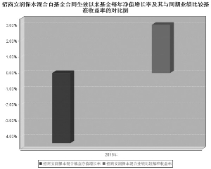 基金管理人:招商基金管理有限公司 基金托管人:中国银行股份有限公司 送出日期:2014年3月28日 §1 重要提示 基金管理人的董事会、董事保证本报告所载资料不存在虚假记载、误导性陈述或重大遗漏,并对其内容的真实性、准确性和完整性承担个别及连带的法律责任。本年度报告已经三分之二以上独立董事签字同意,并由董事长签发。 基金托管人中国银行股份有限公司根据本基金合同规定,于2014年3月26日复核了本报告中的财务指标、净值表现、利润分配情况、财务会计报告、投资组合报告等内容,保证复核内容不存在虚假记载、误导性陈述或者重大遗漏。 基金管理人承诺以诚实信用、勤勉尽责的原则管理和运用基金资产,但不保证基金一定盈利。 基金的过往业绩并不代表其未来表现。投资有风险,投资者在作出投资决策前应仔细阅读本基金的招募说明书及其更新。 本年度报告摘要摘自年度报告正文,投资者欲了解详细内容,应阅读年度报告正文。 本报告财务资料已经审计,毕马威华振会计师事务所(特殊普通合伙)为本基金出具了2013年度无保留意见的审计报告,请投资者注意阅读。 本报告期自2013年4月19日(基金合同生效日)起至12月31日止。 §2 基金简介 2.1 基金基本情况 ■ 2.2 基金产品说明 ■ 2.3 基金管理人和基金托管人 ■ 2.4 信息披露方式 ■ §3 主要财务指标、基金净值表现及利润分配情况 3.1 主要会计数据和财务指标 金额单位:人民币元 ■ 注:1、基金业绩指标不包括持有人认(申)购或交易基金的各项费用,计入费用后实际收益水平要低于所列数字; 2、本期已实现收益指基金本期利息收入、投资收益、其他收入(不含公允价值变动收益)扣除相关费用后的余额,本期利润为本期已实现收益加上本期公允价值变动收益; 3、对期末可供分配利润,采用期末资产负债表中未分配利润与未分配利润中已实现部分的孰低数; 4、本基金合同于2013年4月19日生效,截至本报告期末成立未满1年,本报告期为非完整会计年度。 3.2 基金净值表现 3.2.1 基金份额净值增长率及其与同期业绩比较基准收益率的比较 ■ 注:业绩比较基准收益率=三年期银行定期存款收益率(税后) 。 3.2.2 自基金合同生效以来基金份额累计净值增长率变动及其与同期业绩比较基准收益率变动的比较 ■ 注:1、根据基金合同第十三条(二)投资范围的规定,本基金投资于股票等收益资产占基金资产的比例不高于40%;债券、货币市场工具等保本资产占基金资产的比例不低于60%,其中基金保留不低于基金资产净值5%的现金或者到期日在一年以内的政府债券。本基金于2013年4月19日成立,建仓期结束时相关比例均符合上述规定的要求。 2、本基金合同于2013年4月19日生效,截至本报告期末基金成立未满1年。 3.2.3 自基金合同生效以来基金每年净值增长率及其与同期业绩比较基准收益率的比较 ■ 注:本基金合同于2013年4月19日生效,截至本报告期末基金成立未满1年,故本报告期净值增长率按当年实际存续期计算。 3.3 过去三年基金的利润分配情况 本基金于2013年4月19日成立,自基金合同生效日以来未进行利润分配。 §4 管理人报告 4.1 基金管理人及基金经理情况 4.1.1 基金管理人及其管理基金的经验 招商基金管理有限公司于2002年12月27日经中国证监会(2002)100号文批准设立,是中国第一家中外合资基金管理公司。公司的经营范围包括发起设立基金、基金管理业务和中国证监会批准的其它业务。 经招商基金管理有限公司(以下简称“本公司”)股东会审议通过,并经中国证券监督管理委员会证监许可[2013]1074号文批复同意,本公司原股东荷兰投资公司(ING Asset Management B.V.)将其持有的本公司21.6%股权转让给招商银行股份有限公司、11.7%股权转让给招商证券股份有限公司,截止2013年10月份,本次股权转让的相关工商变更登记手续已办理完毕。 目前,本公司的股东股权结构为:招商银行股份有限公司持有公司全部股权的55%,招商证券股份有限公司持有公司全部股权的45%。公司注册资本金为2.1亿元人民币。招商基金拥有两家全资子公司,分别为招商财富资产管理有限公司和招商资产管理(香港)有限公司。 截至2013年12月31日,本基金管理人共管理三十五只共同基金,具体如下:从2003年4月28日起管理招商安泰系列开放式证券投资基金(含招商安泰股票证券投资基金、招商安泰平衡型证券投资基金、招商安泰债券投资基金);从2004年1月14日起管理招商现金增值开放式证券投资基金;从2004年6月1日起开始管理招商先锋证券投资基金;从2005年11月17日起开始管理招商优质成长股票型证券投资基金(LOF);从2006年7月11日起开始管理招商安本增利债券型证券投资基金;从2007年3月30日起开始管理招商核心价值混合型证券投资基金;从2008年6月19日起开始管理招商大盘蓝筹股票型证券投资基金;从2008年10月22日起开始管理招商安心收益债券型证券投资基金;从2009年6月19日起开始管理招商行业领先股票型证券投资基金;从2009年12月25日起开始管理招商中小盘精选股票型证券投资基金;从2010年3月25日起开始管理招商全球资源股票型证券投资基金(QDII);从2010年6月22日起开始管理招商深证100指数证券投资基金;从2010年6月25日起开始管理招商信用添利债券型证券投资基金;从2010年12月8日开始管理上证消费80交易型开放式指数证券投资基金及招商上证消费80交