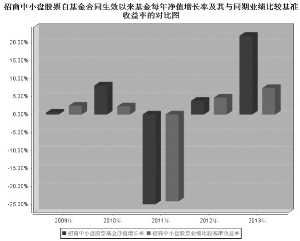 基金管理人:招商基金管理有限公司 基金托管人:中国工商银行股份有限公司 送出日期:2014年3月28日 §1 重要提示 基金管理人的董事会、董事保证本报告所载资料不存在虚假记载、误导性陈述或重大遗漏,并对其内容的真实性、准确性和完整性承担个别及连带的法律责任。本年度报告已经三分之二以上独立董事签字同意,并由董事长签发。 基金托管人中国工商银行股份有限公司根据本基金合同规定,于2014年3月26日复核了本报告中的财务指标、净值表现、利润分配情况、财务会计报告、投资组合报告等内容,保证复核内容不存在虚假记载、误导性陈述或者重大遗漏。 基金管理人承诺以诚实信用、勤勉尽责的原则管理和运用基金资产,但不保证基金一定盈利。 基金的过往业绩并不代表其未来表现。投资有风险,投资者在作出投资决策前应仔细阅读本基金的招募说明书及其更新。 本年度报告摘要摘自年度报告正文,投资者欲了解详细内容,应阅读年度报告正文。 本报告财务资料已经审计,德勤华永会计师事务所(特殊普通合伙)为本基金出具了2013年度无保留意见的审计报告,请投资者注意阅读。 本报告期自2013年1月1日起至12月31日止。 §2 基金简介 2.1 基金基本情况 ■ 2.2 基金产品说明 ■ 2.3 基金管理人和基金托管人 ■ 2.4 信息披露方式 ■ §3 主要财务指标、基金净值表现及利润分配情况 3.1 主要会计数据和财务指标 金额单位:人民币元 ■ 注:1、基金业绩指标不包括持有人认(申)购或交易基金的各项费用,计入费用后实际收益水平要低于所列数字; 2、本期已实现收益指基金本期利息收入、投资收益、其他收入(不含公允价值变动收益)扣除相关费用后的余额,本期利润为本期已实现收益加上本期公允价值变动收益; 3、期末可供分配利润,采用期末资产负债表中未分配利润与未分配利润中已实现部分的孰低数; 3.2 基金净值表现 3.2.1 基金份额净值增长率及其与同期业绩比较基准收益率的比较 ■ 注:业绩比较基准收益率=40%×天相中盘指数收益率+40%×天相小盘指数收益率+ 20%×中信标普全债指数收益率,业绩比较基准在每个交易日实现再平衡。 3.2.2 自基金合同生效以来基金份额累计净值增长率变动及其与同期业绩比较基准收益率变动的比较 ■ 注:根据基金合同第十一条(二)投资范围的规定,本基金将基金资产的60%-95%投资于股票等权益类资产(其中,权证投资比例不超过基金资产净值的3%),将基金资产的5%-40%投资于债券和现金等固定收益类品种(其中,现金或到期日在一年以内的政府债券不低于基金资产净值的5%)。本基金于2009年12月25日成立,自基金成立日起6个月内为建仓期,建仓期结束时相关比例均符合上述规定的要求。 3.2.3 自基金合同生效以来基金每年净值增长率及其与同期业绩比较基准收益率的比较 ■ 注:本基金于2009年12月25日成立,截至2009年12月31日成立未满1年,故成立当年的净值增长率按当年实际存续期计算。 3.3 过去三年基金的利润分配情况 本基金过去三年未进行利润分配。 §4 管理人报告 4.1 基金管理人及基金经理情况 4.1.1 基金管理人及其管理基金的经验 招商基金管理有限公司于2002年12月27日经中国证监会(2002)100号文批准设立,是中国第一家中外合资基金管理公司。公司的经营范围包括发起设立基金、基金管理业务和中国证监会批准的其它业务。 经招商基金管理有限公司(以下简称“本公司”)股东会审议通过,并经中国证券监督管理委员会证监许可[2013]1074号文批复同意,本公司原股东荷兰投资公司(ING Asset Management B.V.)将其持有的本公司21.6%股权转让给招商银行股份有限公司、11.7%股权转让给招商证券股份有限公司,截止2013年10月份,本次股权转让的相关工商变更登记手续已办理完毕。 目前,本公司的股东股权结构为:招商银行股份有限公司持有公司全部股权的55%,招商证券股份有限公司持有公司全部股权的45%。公司注册资本金为2.1亿元人民币。招商基金拥有两家全资子公司,分别为招商财富资产管理有限公司和招商资产管理(香港)有限公司。 截至2013年12月31日,本基金管理人共管理三十五只共同基金,具体如下:从2003年4月28日起管理招商安泰系列开放式证券投资基金(含招商安泰股票证券投资基金、招商安泰平衡型证券投资基金、招商安泰债券投资基金);从2004年1月14日起管理招商现金增值开放式证券投资基金;从2004年6月1日起开始管理招商先锋证券投资基金;从2005年11月17日起开始管理招商优质成长股票型证券投资基金(LOF);从2006年7月11日起开始管理招商安本增利债券型证券投资基金;从2007年3月30日起开始管理招商核心价值混合型证券投资基金;从2008年6月19日起开始管理招商大盘蓝筹股票型证券投资基金;从2008年10月22日起开始管理招商安心收益债券型证券投资基金;从2009年6月19日起开始管理招商行业领先股票型证券投资基金;从2009年12月25日起开始管理招商中小盘精选股票型证券投资基金;从2010年3月25日起开始管理招商全球资源股票型证券投资基金(QDII);从2010年6月22日起开始管理招商深证100指数证券投资基金;从2010年6月25日起开始管理招商信用添利债券型证券投资基金;从2010年12月8日开始管理上证消费80交易型开放式指数证券投资基金及招商上证消费80交易型开放式指数证券投资基金联接基金;从2011年2月11日起开始管理招商标普