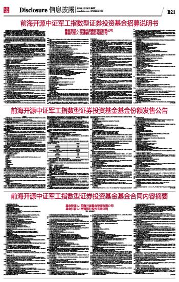 基金管理人:前海开源基金管理有限公司 基金托管人:交通银行股份有限公司 重要提示 本基金经2014年3月14日中国证券监督管理委员会下发的证监许可[2014]294号文注册募集。 基金管理人保证本招募说明书的内容真实、准确、完整。本招募说明书经中国证监会注册,但中国证监会对本基金募集的注册,并不表明其对本基金的价值和收益作出实质性判断或保证,也不表明投资于本基金没有风险。 本基金投资于证券市场,基金净值会因为证券市场波动等因素产生波动,投资人在投资本基金前,应全面了解本基金的产品特性,充分考虑自身的风险承受能力,理性判断市场,并承担基金投资中出现的各类风险,包括但不限于:市场风险、信用风险、管理风险、流动性风险、操作和技术风险、合规性风险、本基金特有的风险及其他风险等。 基金的过往业绩并不预示其未来表现,基金管理人管理的其他基金的业绩并不构成对本基金表现的保证。 基金管理人依照恪尽职守、诚实信用、谨慎勤勉的原则管理和运用基金财产,但不保证基金一定盈利,也不保证最低收益。基金管理人提醒投资人基金投资的“买者自负”原则,在投资人作出投资决策后,基金运营状况与基金净值变化引致的投资风险,由投资人自行承担。投资有风险,投资人在投资本基金前应认真阅读本基金的招募说明书和基金合同。 一、绪 言 本招募说明书依据《中华人民共和国证券投资基金法》(以下简称《基金法》)、《证券投资基金运作管理办法》(以下简称《运作办法》)、《证券投资基金销售管理办法》(以下简称《销售办法》)、《证券投资基金信息披露管理办法》(以下简称《信息披露办法》)等有关法律法规的规定,以及《前海开源中证军工指数型证券投资基金基金合同》(以下简称基金合同)的约定编写。 本招募说明书阐述了前海开源中证军工指数型证券投资基金(以下简称“本基金”或“基金”)的投资目标、策略、风险、费率等与投资人投资决策有关的必要事项,投资人在做出投资决策前应仔细阅读本招募说明书。 基金管理人承诺本招募说明书不存在任何虚假记载、误导性陈述或者重大遗漏,并对其真实性、准确性、完整性承担法律责任。本基金是根据本招募说明书所载明的资料申请募集的。本基金管理人没有委托或授权任何其他人提供未在本招募说明书中载明的信息,或对本招募说明书作任何解释或者说明。 本招募说明书根据本基金的基金合同编写,并经中国证监会注册。基金合同是约定基金当事人之间权利、义务的法律文件。基金投资人自依基金合同取得基金份额,即成为基金份额持有人和基金合同的当事人,其持有基金份额的行为本身即表明其对基金合同的承认和接受,并按照《基金法》、基金合同及其他有关规定享有权利、承担义务。基金投资人欲了解基金份额持有人的权利和义务,应详细查阅基金合同。 二、释 义 在本招募说明书中,除非文意另有所指,下列词语或简称具有如下含义: 1、基金或本基金:指前海开源中证军工指数型证券投资基金 2、基金管理人:指前海开源基金管理有限公司 3、基金托管人:指交通银行股份有限公司 4、基金合同或本基金合同:指《前海开源中证军工指数型证券投资基金基金合同》及对本基金合同的任何有效修订和补充 5、托管协议:指基金管理人与基金托管人就本基金签订之《前海开源中证军工指数型证券投资基金托管协议》及对该托管协议的任何有效修订和补充 6、招募说明书:指《前海开源中证军工指数型证券投资基金招募说明书》及其定期的更新 7、基金份额发售公告:指《前海开源中证军工指数型证券投资基金基金份额发售公告》 8、法律法规:指中国现行有效并公布实施的法律、行政法规、规范性文件、司法解释、行政规章以及其他对基金合同当事人有约束力的决定、决议、通知等 9、《基金法》:指2012年12月28日经第十一届全国人民代表大会常务委员会第三十次会议修订通过并于2013年6月1日起施行的《中华人民共和国证券投资基金法》及颁布机关对其不时做出的修订 10、《销售办法》:指中国证监会2013年2月17日修订通过并于2013年6月1日起施行的《证券投资基金销售管理办法》及颁布机关对其不时做出的修订 11、《信息披露办法》:指中国证监会2004年6月8日颁布、同年7月1日起实施的《证券投资基金信息披露管理办法》及颁布机关对其不时做出的修订 12、《运作办法》:指中国证监会2004年6月29日颁布、同年7月1日实施并于2012年6月19日修订的《证券投资基金运作管理办法》及颁布机关对其不时做出的修订 13、中国证监会:指中国证券监督管理委员会 14、银行业监督管理机构:指中国人民银行和/或中国银行业监督管理委员会 15、基金合同当事人:指受基金合同约束,根据基金合同享有权利并承担义务的法律主体,包括基金管理人、基金托管人和基金份额持有人 16、个人投资者:指依据有关法律法规规定可投资于证券投资基金的自然人 17、机构投资者:指依法可以投资证券投资基金的、在中华人民共和国境内合法登记并存续或经有关政府部门批准设立并存续的企业法人、事业法人、社会团体或其他组织 18、合格境外机构投资者:指符合《合格境外机构投资者境内证券投资管理办法》及相关法律法规规定可以投资于在中国境内