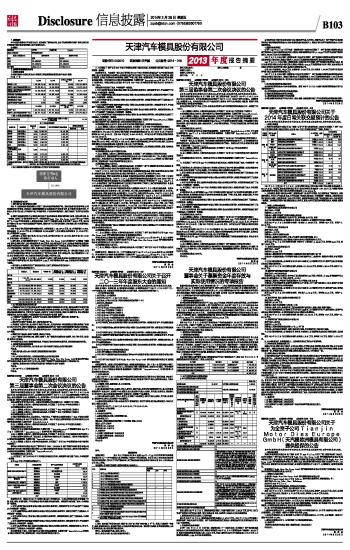 证券代码:002510 证券简称:天汽模 公告编号:2014-018 天津汽车模具股份有限公司2013年度报告摘要 2014-03-28 来源:证券时报网 作者: