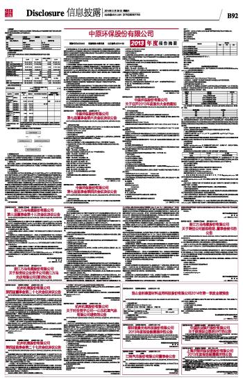 中原环保股份有限公司2013年度报告摘要 2014-03-29 来源:证券时报网 作者: