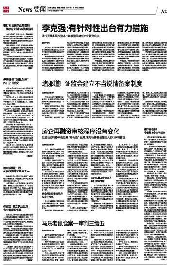房企再融资审核程序没有变化证监会已叫停中山证券“零佣通”服务;未对私募基金管理人实行牌照管理 2014-03-29 来源:证券时报网 作者:程丹