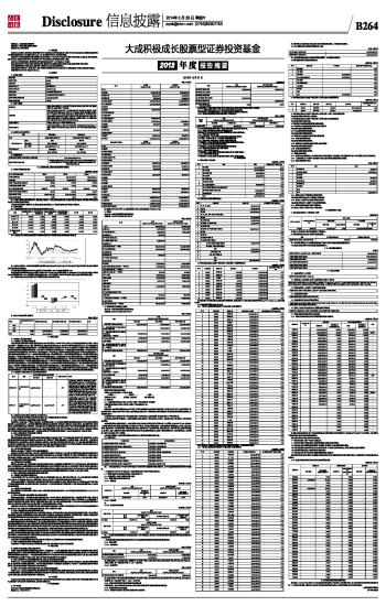 基金管理人:大成基金管理有限公司 基金托管人:中国农业银行股份有限公司 送出日期:2014年3月29日 §1 重要提示 基金管理人的董事会、董事保证本报告所载资料不存在虚假记载、误导性陈述或重大遗漏,并对其内容的真实性、准确性和完整性承担个别及连带的法律责任。本年度报告已经三分之二以上独立董事签字同意,并由董事长签发。 基金托管人中国农业银行股份有限公司根据本基金合同规定,于2014年3月27日复核了本报告中的财务指标、净值表现、利润分配情况、财务会计报告、投资组合报告等内容,保证复核内容不存在虚假记载、误导性陈述或者重大遗漏。 基金管理人承诺以诚实信用、勤勉尽责的原则管理和运用基金资产,但不保证基金一定盈利。 基金的过往业绩并不代表其未来表现。投资有风险,投资者在作出投资决策前应仔细阅读本基金的招募说明书及其更新。 本年度报告摘要摘自年度报告正文,投资者欲了解详细内容,应阅读年度报告正文。 本报告财务资料已经审计。普华永道中天会计师事务所(特殊普通合伙)为本基金出具了无保留意见的审计报告,请投资者注意阅读。 本报告期自2013年01月01日起至12月31日止。 §2 基金简介 2.1 基金基本情况 ■ 2.2 基金产品说明 ■ 2.3 基金管理人和基金托管人 ■ 2.4 信息披露方式 ■ §3 主要财务指标、基金净值表现及利润分配情况 3.1 主要会计数据和财务指标 金额单位:人民币元 ■ 注:1、本期已实现收益指本期利息收入、投资收益、其他收入(不含公允价值变动收益)扣除相关费用后的余额,本期利润为本期已实现收益加上本期公允价值变动收益。 2、所述基金业绩指标不包括持有人认购或交易基金的各项费用,计入费用后实际收益水平要低于所列数字。 3.2 基金净值表现 3.2.1 基金份额净值增长率及其与同期业绩比较基准收益率的比较 ■ 3.2.2 自基金合同生效以来基金份额累计净值增长率变动及其与同期业绩比较基准收益率变动的比较 ■ 注:1、按基金合同规定,大成积极成长股票型证券投资基金自基金合同生效之日起3个月内为建仓期,截至本报告期本基金的各项投资比例已达到基金合同的规定。 2、本基金业绩比较基准自2009年2月2日起变更为:沪深300指数×80%+中证综合债券指数×20%, 本基金业绩比较基准收益率的历史走势图从2007年1月15日(基金合同生效暨基金转型日)至2009年2月1日为原业绩比较基准(新华富时600成长指数收益率×80%+新华雷曼中国全债指数收益率×20%)的走势图,2009年2月2日起为变更后的业绩比较基准的走势图。 3.2.3 过去五年基金每年净值增长率及其与同期业绩比较基准收益率的比较 ■ 3.3 过去三年基金的利润分配情况 单位:人民币元 ■ §4 管理人报告 4.1 基金管理人及基金经理情况 4.1.1 基金管理人及其管理基金的经验 大成基金管理有限公司经中国证监会证监基金字[1999]10号文批准,于1999年4月12日正式成立,是中国证监会批准成立的首批十家基金管理公司之一,注册资本为2亿元人民币,注册地为深圳。目前公司由四家股东组成,分别为中泰信托有限责任公司(48%)、光大证券股份有限公司(25%)、中国银河投资管理有限公司(25%)、广东证券股份有限公司(2%)。截至2013年12月31日,本基金管理人共管理2只封闭式证券投资基金:景宏证券投资基金及景福证券投资基金,4只ETF及2只ETF联接基金:深证成长40ETF、大成深证成长40ETF联接基金、中证500沪市ETF及大成中证500沪市ETF联接基金、中证100ETF、中证500深市ETF,1只QDII基金:大成标普500等权重指数基金及31只开放式证券投资基金:大成景丰债券型证券投资基金(LOF)、大成价值增长证券投资基金、大成债券投资基金、大成蓝筹稳健证券投资基金、大成精选增值混合型证券投资基金、大成货币市场证券投资基金、大成沪深300指数证券投资基金、大成财富管理2020生命周期证券投资基金、大成积极成长股票型证券投资基金、大成创新成长混合型证券投资基金(LOF)、大成景阳领先股票型证券投资基金、大成强化收益债券型证券投资基金、大成策略回报股票型证券投资基金、大成行业轮动股票型证券投资基金、大成中证红利指数证券投资基金、大成核心双动力股票型证券投资基金、大成保本混合型证券投资基金、大成内需增长股票型证券投资基金、大成中证内地消费主题指数证券投资基金、大成可转债增强债券型证券投资基金、大成新锐产业股票型证券投资基金、大成景恒保本混合型证券投资基金、大成优选股票型证券投资基金(LOF)、大成现金增利货币市场基金、大成月添利理财债券型证券投资基金、大成理财21天债券型发起式基金、大成现金宝场内实时申赎货币市场基金、大成景安短融债券型证券投资基金、大成景兴信用债债券型证券投资基金、大成景旭纯债债券型证券投资基金及大成景祥分级债券型证券投资基金。 4.1.2 基金经理(或基金经理小组)及基金经理助理简介 ■ 注:1、任职日期、离任日期为本基金管理人作出决定之日。 2、证券从业年限的计算标准遵从行业协会《证券业从业人员资格管理办法》的相关规定。 4.2 管理人对报告期内本基金运作遵规守信情况的说明 本报告期内,本基金管理人严格遵守《证券法》、《证券投资基金法》、《大成积极成长股票型证券投资基金基金合同》和其他有关法律法规的规定,在基金