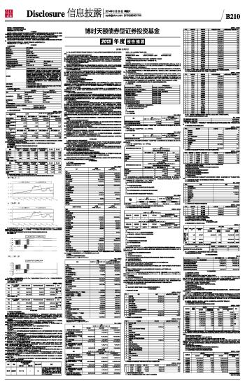 基金管理人:博时基金管理有限公司 基金托管人:中国工商银行股份有限公司 报告送出日期:2014年3月29日 §1重要提示 基金管理人的董事会、董事保证本报告所载资料不存在虚假记载、误导性陈述或重大遗漏,并对其内容的真实性、准确性和完整性承担个别及连带的法律责任。本年度报告已经三分之二以上独立董事签字同意,并由董事长签发。 基金托管人中国工商银行股份有限公司根据本基金合同规定,于2014年3月28日复核了本报告中的财务指标、净值表现、利润分配情况、财务会计报告、投资组合报告等内容,保证复核内容不存在虚假记载、误导性陈述或者重大遗漏。 基金管理人承诺以诚实信用、勤勉尽责的原则管理和运用基金资产,但不保证基金一定盈利。 基金的过往业绩并不代表其未来表现。投资有风险,投资者在作出投资决策前应仔细阅读本基金的招募说明书及其更新。 本年度报告摘要摘自年度报告正文,投资者欲了解详细内容,应阅读年度报告正文。 本报告期自2013年1月1日起至12月31日止。 §2基金简介 2.1基金基本情况 ■ 2.2基金产品说明 ■ 2.3基金管理人和基金托管人 ■ 2.4信息披露方式 ■ §3主要财务指标、基金净值表现及利润分配情况 3.1主要会计数据和财务指标 金额单位:人民币元 ■ 注:本基金合同于2012年2月29日生效。 本期已实现收益指基金本期利息收入、投资收益、其他收入(不含公允价值变动收益)扣除相关费用后的余额,本期利润为本期已实现收益加上本期公允价值变动收益。 上述基金业绩指标不包括持有人认购或交易基金的各项费用,计入费用后实际收益水平要低于所列数字。 3.2基金净值表现 3.2.1基金份额净值增长率及其与同期业绩比较基准收益率的比较 博时天颐债券 A类: ■ 博时天颐债券 C类: ■ 注:本基金的业绩比较基准为:三年期定期存款利率(税后)+1%。 3.2.2自基金合同生效以来基金份额累计净值增长率变动及其与同期业绩比较基准收益率变动的比较 ■ 注:本基金的基金合同于2012年2月29日生效。按照本基金的基金合同规定,自基金合同生效之日起六个月内使基金的投资组合比例符合本基金合同第十四条“(二)投资范围”、“(七)投资禁止行为与限制”的有关约定。本基金建仓期结束时各项资产配置比例符合基金合同约定。 3.2.3自基金合同生效以来基金每年净值增长率及其与同期业绩比较基准收益率的比较 博时天颐债券A类 ■ 注:本基金2012年实际运作期间为2012年2月29日(基金合同生效日)至2012年12月31日,合同生效当年按实际存续期计算,不按整个自然年度进行折算。 3.3过去三年基金的利润分配情况 1、博时天颐债券 A类: 金额单位:人民币元 ■ 2、博时天颐债券 C类: 单位:人民币元 ■ §4管理人报告 4.1基金管理人及基金经理情况 4.1.1基金管理人及其管理基金的经验 博时基金管理有限公司是中国内地首批成立的五家基金管理公司之一。“为国民创造财富”是博时的使命。博时的投资理念是“做投资价值的发现者”。截至2013年12月31日,博时基金公司共管理四十六只开放式基金和一只封闭式基金,并且受全国社会保障基金理事会委托管理部分社保基金,以及多个企业年金账户,公募基金资产规模逾1052亿元人民币,累计分红超过608亿元人民币,是目前我国资产管理规模最大的基金公司之一,养老金资产管理规模在同业中名列前茅。 1、基金业绩 根据银河证券基金研究中心统计,股票型基金中,截至12月31日,博时医疗保健今年以来净值增长率在328只标准型股票基金中排名前1/4。混合灵活配置型基金方面,博时回报今年以来收益率在71只同类基金中排名前1/2。 固定收益方面,2013年博时信用债纯债基金收益率在17只长期标准债券型基金中排名前1/3;博时裕祥分级债券A收益率在17只封闭式债券型分级子基金(优先份额)中名列第2。 海外投资方面,博时大中华亚太精选2013年收益率在7只QDII亚太股票型基金中排名第2。 2、客户服务 2013年全年,博时基金共举办各类渠道培训活动1534场,参加人数38251人。 3、其他大事件 1)2013年1月30日,博时亚洲票息债券基金由于达到募集份额目标上限18亿份而提前结束募集,同时启动末日比例配售,配售比例约为63.35%。 2)2013年3月29日,由证券时报社主办的2012年度中国基金业明星奖颁奖典礼暨明星基金论坛在北京举行。博时主题行业基金荣获“2012 年度股票型明星基金奖”。 3)2013年3月30日,由中国证券报社主办的第十届中国基金业金牛奖颁奖典礼暨2013金牛基金论坛在北京举行。博时基金蝉联“金牛基金管理公司”奖,博时基金价值组投资总监、博时主题行业基金经理邓晓峰获得“金牛基金十周年特别奖”,博时现金收益荣获“2012年度货币市场金牛基金”。 4)2013年4月,在股市动态分析杂志主办的“2012基金公司品牌管理与营销策划能力排行榜”评选活动中,博时标普500指数基金获得“2012年基金新产品营销策划案例奖”。 5)2013年4月10日,由上海证券报举办的第十届“金基金奖”颁奖典礼在上海举行,博时基金荣获金“基金十年·卓越公司奖”,博时裕阳封闭和博时裕隆封闭荣获“金基金十年·投资回报奖”,博时主题行业基金荣获“金基金·股票型基金奖5年期奖”,博时裕阳封闭荣获“金基金·分红基金奖3年期奖”。 6)2013年4月27日,由中国网、普益财富、西南财经大学信托与理财研究所三家机