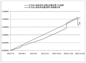 基金管理人:东方基金管理有限责任公司 基金托管人:中国邮政储蓄银行股份有限公司 报告送出日期:二〇一四年三月二十九日 §1重要提示及目录 1.1重要提示 基金管理人的董事会、董事保证本报告所载资料不存在虚假记载、误导性陈述或重大遗漏,并对其内容的真实性、准确性和完整性承担个别及连带的法律责任。本年度报告已经三分之二以上独立董事签字同意,并由董事长签发。 基金托管人中国邮政储蓄银行股份有限公司根据本基金合同规定,于2014年3月24日复核了本报告中的财务指标、净值表现、利润分配情况、财务会计报告、投资组合报告等内容,保证复核内容不存在虚假记载、误导性陈述或者重大遗漏。 基金管理人承诺以诚实信用、勤勉尽责的原则管理和运用基金资产,但不保证基金一定盈利。 基金的过往业绩并不代表其未来表现。投资有风险,投资者在作出投资决策前应仔细阅读本基金的招募说明书及其更新。 本年度报告摘要摘自年度报告正文,投资者欲了解详细内容,应阅读年度报告正文。 立信会计师事务所(特殊普通合伙)为基金财务出具了标准无保留意见的审计报告,基金管理人在本报告中对相关事项亦有详细说明,请投资者注意阅读。 本报告期自2013年7月3日起至12月31日止。 §2基金简介 2.1基金基本情况 ■ 2.2基金产品说明 ■ 2.3基金管理人和基金托管人 ■ 2.4信息披露方式 ■ §3主要财务指标、基金净值表现及利润分配情况 3.1主要会计数据和财务指标 金额单位:人民币元 ■ 注:①本期已实现收益指基金本期利息收入、投资收益、其他收入(不含公允价值变动收益)扣除相关费用后的余额,本期利润为本期已实现收益加上本期公允价值变动收益。 ②期末可供分配利润:如果期末未分配利润的未实现部分为正数,则期末可供分配利润的金额为期末未分配利润的已实现部分,如果期末未分配利润的未实现部分为负数,则期末可供分配利润的金额为期末未分配利润(已实现部分扣除未实现部分)。 ③本基金所述业绩指标不包括持有人认购或交易基金的各项费用,计入费用后实际收益水平要低于所列数字。 ④本基金基金合同于2013年7月3日生效,至报告期末不满一年。 3.2基金净值表现 3.2.1基金份额净值增长率及其与同期业绩比较基准收益率的比较 ■ 3.2.2 自基金合同生效以来基金份额累计净值增长率变动及其与同期业绩比较基准收益率变动的比较 东方安心收益保本混合型证券投资基金 份额累计净值增长率与业绩比较基准收益率历史走势对比图 (2013年7月3日至2013年12月31日) ■ 本基金基金合同生效日2013年7月3日至报告期末未满1年。按基金合同和招募说明书的约定,本基金自基金合同生效日起6个月内为建仓期,截至报告期末本基金仍处于建仓期。 3.2.3 自基金合同生效以来基金每年净值增长率及其与同期业绩比较基准收益率的比较 东方安心收益保本混合型证券投资基金 合同生效以来净值增长率与业绩比较基准收益率的对比图 ■ 本基金合同于2013年7月3日生效,合同生效当年按实际存续期计算,不按整个自然年度进行折算。 3.3过去三年基金的利润分配情况 本基金自合同生效日(2013年7月3日)至报告期截止日(2013年12月31日)未进行利润分配。 §4管理人报告 4.1基金管理人及基金经理情况 4.1.1基金管理人及其管理基金的经验 本基金管理人为东方基金管理有限责任公司。东方基金管理有限责任公司(以下简称“本公司”)经中国证监会批准(证监基金字【2004】80号)于2004年6月11日成立,是《中华人民共和国证券投资基金法》施行后成立的第一家基金管理公司。本公司注册资本2亿元人民币。本公司股东为东北证券股份有限公司,持有股份64%;河北省国有资产控股运营有限公司,持有股份27%;渤海国际信托有限公司,持有股份9%。截止2013年12月31日,本公司管理十二只开放式证券投资基金——东方龙混合型开放式证券投资基金、东方精选混合型开放式证券投资基金、东方金账簿货币市场证券投资基金、东方策略成长股票型开放式证券投资基金、东方稳健回报债券型证券投资基金、东方核心动力股票型开放式证券投资基金、东方保本混合型开放式证券投资基金、东方增长中小盘混合型开放式证券投资基金、东方强化收益债券型证券投资基金、东方央视财经50指数增强型证券投资基金、东方安心收益保本混合型证券投资基金、东方利群混合型发起式证券投资基金。 4.1.2基金经理(或基金经理小组)及基金经理助理的简介 ■ 注:①此处的任职日期和离任日期均指在法定信息披露媒体正式公告之日。 ②证券从业的含义遵从行业协会《证券业从业人员资格管理办法》的相关规定。 4.2管理人对报告期内本基金运作遵规守信情况的说明 基金管理人在本报告期内严格遵守《中华人民共和国证券法》、《中华人民共和国证券投资基金法》、《证券投资基金管理公司管理办法》及其各项实施准则、《东方安心收益保本混合型证券投资基金基金合同》和其他有关法律法规的规定,本着诚实信用、勤勉尽责的原则管理和运作基金资产,在严格控制风险的基础上,为基金份额持有人谋求最大利益,无损害基金份额持有人利益的行为。本基金无违法、违规行为。本基金投资组合符合有关法规及基金合同的约定。 4.3管理人对报告期内公平交易情况的专项说明 4