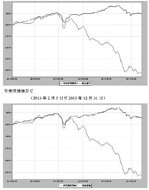 基金管理人:华安基金管理有限公司 基金托管人:中国农业银行股份有限公司 报告送出日期:二〇一四年三月三十一日 §1 重要提示及目录 1.1 重要提示 基金管理人的董事会、董事保证本报告所载资料不存在虚假记载、误导性陈述或重大遗漏,并对其内容的真实性、准确性和完整性承担个别及连带的法律责任。本年度报告已经三分之二以上独立董事签字同意,并由董事长签发。 基金托管人中国农业银行股份有限公司根据本基金合同规定,于2014年3月21日复核了本报告中的财务指标、净值表现、利润分配情况、财务会计报告、投资组合报告等内容,保证复核内容不存在虚假记载、误导性陈述或者重大遗漏。 基金管理人承诺以诚实信用、勤勉尽责的原则管理和运用基金资产,但不保证基金一定盈利。 基金的过往业绩并不代表其未来表现。投资有风险,投资者在作出投资决策前应仔细阅读本基金的招募说明书及其更新。 本年度报告摘要摘自年度报告正文,投资者欲了解详细内容,应阅读年度报告正文。 本报告期自2013年2月5日起至12月31日止。 §2 基金简介 2.1 基金基本情况 ■ 2.2 基金产品说明 ■ 2.3 基金管理人和基金托管人 ■ 2.4 信息披露方式 ■ §3 主要财务指标、基金净值表现及利润分配情况 3.1 主要会计数据和财务指标 单位:人民币元 ■ 注:1、所述基金业绩指标不包括持有人认购或交易基金的各项费用(例如:开放式基金的申购赎回费、红利再投资费、基金转换费等),计入费用后实际收益水平要低于所列数字。 2、本期已实现收益指基金本期利息收入、投资收益、其他收入(不含公允价值变动收益)扣除相关费用后的余额,本期利润为本期已实现收益加上本期公允价值变动收益。 3、期末可供分配利润采用期末资产负债表中未分配利润与未分配利润中已实现部分的孰低数(为期末余额,不是当期发生数)。 4、本基金于2013年2月5日成立,截至本报告期末,本基金成立未满一年。 3.2 基金净值表现 3.2.1基金份额净值增长率及其与同期业绩比较基准收益率的比较 华安纯债债券A: ■ 华安纯债债券C: ■ 注:本基金业绩比较基准:中国债券综合指数收益率 根据本基金合同的有关规定:本基金的投资范围为具有良好流动性的金融工具,包括国债、央行票据、地方政府债、金融债、企业债、短期融资券、中期票据、公司债、资产支持证券、中小企业私募债券、债券回购、银行存款等固定收益类资产以及法律法规或中国证监会允许基金投资的其他金融工具,但须符合中国证监会相关规定。本基金不直接在二级市场买入股票、权证等权益类资产,也不参与一级市场新股申购和新股增发。本基金不投资可转换债券,但可以投资分离交易可转债上市后分离出来的债券。 本基金各类资产的投资比例范围为:固定收益类资产的比例不低于基金资产的80%;现金或到期日在一年以内的政府债券的比例合计不低于基金资产净值的5%。 3.2.2 自基金合同生效以来基金份额累计净值增长率变动及其与同期业绩比较基准收益率变动的比较 华安纯债债券型发起式证券投资基金 份额累计净值增长率与业绩比较基准收益率历史走势对比图 (2013年2月5日至2013年12月31日) 华安纯债债券A (2013年2月5日至2013年12月31日) ■ 注:1、本基金于 2013 年2月5日成立,截止本报告期末,本基金成立不满一年。 2、根据《华安纯债债券型发起式证券投资基金基金合同》,本基金建仓期为6 个月。基金管理人自基金合同生效之日起 6 个月内已使基金的投资组合比例符合基金合同的有关约定。 3.2.3 自基金合同生效以来基金每年净值增长率及其与同期业绩比较基准收益率的比较 华安纯债债券型发起式证券投资基金 合同生效日以来净值增长率与业绩比较基准收益率的柱形对比图 华安纯债债券A ■ 注:合同生效当年按实际存续期计算,不按整个自然年度进行折算。 3.3过去三年基金的利润分配情况 1、华安纯债债券A 金额单位:人民币元 ■ 2、华安纯债债券C 金额单位:人民币元 ■ §4 管理人报告 4.1 基金管理人及基金经理情况 4.1.1基金管理人及其管理基金的经验 华安基金管理有限公司经中国证监会证监基金字[1998]20号文批准于1998年6月设立,是国内首批基金管理公司之一,注册资本1.5亿元人民币,公司总部设在上海陆家嘴金融贸易区。目前的股东为上海电气(集团)总公司、上海国际信托有限公司、上海工业投资(集团)有限公司、上海锦江国际投资管理有限公司和国泰君安投资管理股份有限公司。 截至2013年12月31日,公司旗下共管理了华安安顺封闭1只封闭式证券投资基金,华安创新混合、华安中国A股增强指数、华安现金富利货币、华安宝利配置混合、华安宏利股票、华安中小盘成长股票、华安策略优选股票、华安核心优选股票、华安稳定收益债券、华安动态灵活混合、华安强化收益债券、华安行业轮动股票、华安上证180ETF、华安上证180ETF联接、华安上证龙头企业ETF、龙头ETF联接、华安升级主题股票、华安稳固收益债券、华安可转换债基金、华安深证300指数基金(LOF)、华安科技动力股票、华安四季红债券、华安香港精选股票、华安大中华升级股票、华安标普石油指数基金(QDII-LOF)、华安月月鑫短期理财债券、华安季季鑫短期理财债券、华安月安鑫短期理财债券、华安七日鑫短期理财债券、华安沪深300指数分级