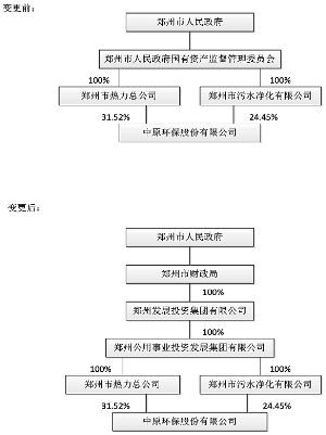 本公司及董事会全体成员保证信息披露的内容真实、准确、完整,没有虚假记载、误导性陈述或者重大遗漏。 中原环保股份有限公司(以下简称"公司")于2014年4月4日收到国有股东郑州市热力总公司(以下简称"热力公司")《关于郑州市热力总公司国有股权无偿划转有关事项的通知》和国有股东郑州市污水净化有限公司(以下简称"净化公司")《关于郑州市污水净化有限公司国有股权无偿划转有关事项的通知》,现将有关情况公告如下: 一、国有股东股权划转概述 热力公司于4月2日接到《郑州市人民政府国有资产监督管理委员会关于郑州市热力总公司国有产权划转有关问题的批复》(郑国资[2014]97号)文件,经郑州市人民政府批准,同意将郑州市热力总公司100%国有股权无偿划入郑州公用事业投资发展集团有限公司。 净化公司于4月3日接到《郑州市人民政府国有资产监督管理委员会关于郑州市污水净化有限公司国有产权划转有关问题的批复》(郑国资[2014]98号)文件,经郑州市人民政府批准,同意将郑州市污水净化有限公司100%国有股权无偿划入郑州公用事业投资发展集团有限公司。 二、受让方基本情况 名称:郑州公用事业投资发展集团有限公司 (以下简称"公用集团") 住所:郑州市中原区文化宫路南3号院1号楼附1号3层 法定代表人:赵新民 注册资本: 叁仟万圆整 公司类型:有限责任公司(自然人投资或控股的法人独资) 成立时间:2013年09月12日 经营范围:从事城市市政公用事业项目投资、建设、运营、管理;从事城市基础设施建设;从事工程设计、工程施工、设备安装、维修服务。 三、本次股权划转对公司的影响 1、热力公司、净化公司、公用集团均是郑州市人民政府所属的国有独资公司,本次股权划转属于企业国有产权无偿划转,国有股东的经济性质未发生变化。 2、本次股权划转,公司国有股东持股数未发生变化。划转前,公用集团未持有本公司股份;划转后,公用集团将间接持有公司股份,占公司总股本的55.97%。 本次划转前后公司控股股东、实际控制人关系图 ■ 3、本次股权划转,公司国有股东热力公司和净化公司的国有资产监管和行政管理权限不变,原有经营方式不变,因此,公司的正常经营管理、主营业务不会发生变化,对公司资产、人员、业务、财务、机构等方面的独立性不会产生影响。 4、本次股权划转,公司董事会结构、人员不发生变化。 公司将严格按照相关法律法规规定,密切关注本次股权划转事宜的进展情况,及时履行持续信息披露义务。 四、备查文件 1、关于郑州市热力总公司国有股权无偿划转有关事项的通知 2、关于郑州市污水净化有限公司国有股权无偿划转有关事项的通知 特此公告 中原环保股份有限公司董事会 二〇一四年四月四日 本版导读:
