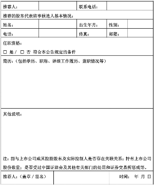 证券代码:002605 证券简称:姚记扑克 公告编号:2014-017 上海姚记扑克股份有限公司 关于监事会换届选举的提示性公告 本公司及董事会全体成员保证信息披露的内容真实、准确、完整,没有虚假记载、误导性陈述或重大遗漏 上海姚记扑克股份有限公司(以下简称"公司"或"本公司")第二届监事会任期于2014年5月29日届满,在换届完成之前公司第二届监事会全体成员将依照有关法律法规的规定继续履行监事职责。为顺利完成监事会的换届选举(以下简称"本次换届选举"),依据《中华人民共和国公司法》(以下简称《公司法》)、《上海姚记扑克股份有限公司章程》(以下简称《公司章程》)和《上海姚记扑克股份有限公司监事会议事规则》等相关规定,将第三届监事会的组成、监事候选人的推荐、本次换届选举的程序、监事候选人任职资格等事项公告如下: 一、第三届监事会的组成 按照公司现行《公司章程》规定,监事会由3名监事组成,其中职工代表监事1名、股东代表监事2名,监事任期自公司相关股东大会选举通过之日起计算,任期三年。 二、选举方式 本次监事换届选举采用累积投票制,即股东大会选举股东代表监事时,每一股份拥有与拟选股东代表监事人数相同的表决权,股东拥有的表决权可以集中使用,也可以分开使用。职工代表监事由本公司职工代表大会选举产生。 三、监事候选人的推荐(监事候选人推荐书样本见附件) (一)股东代表监事候选人的推荐 本公司监事会及在本公告发布之日单独或合并持有公司3%以上股份的股东可向第二届监事会书面提名推荐第三届监事会股东代表监事候选人。单个推荐人推荐的人数不得超过本次拟选股东代表监事人数。 最近二年内曾担任过公司董事或者高级管理人员的监事人数不得超过公司监事总数的二分之一。单一股东提名的监事不得超过公司监事总数的二分之一。 (二)职工代表监事的产生 职工代表出任的监事由本公司职工代表大会选举产生。 四、本次换届选举的程序 1、推荐人在本公告发布之日起7天内以书面方式向本公司监事会推荐监事候选人并提交相关文件。 2、在上述推荐时间届满后,本公司监事会召开会议,对推荐的监事候选人进行资格审查,确定股东代表监事候选人名单,并以提案的方式提请公司股东大会审议。 3、监事候选人应在股东大会召开之前做出书面承诺,同意接受提名,承诺所提供的资料真实、完整并保证当选后履行监事职责。 五、监事任职资格 根据《公司法》、《公司章程》及有关法律法规的规定,本公司监事候选人应为自然人,具有与担任监事相适应的工作阅历和经验,并保证有足够的时间和精力履行监事职责。凡具有下述条款所述事实者不能担任本公司监事: 1、无民事行为能力或者限制民事行为能力; 2、因贪污、贿赂、侵占财产、挪用财产或者破坏社会主义市场经济秩序,被判处刑罚,执行期满未逾5年,或者因犯罪被剥夺政治权利,执行期满未逾5年; 3、担任破产清算的公司、企业的董事或者厂长、经理,对该公司、企业的破产负有个人责任的,自该公司、企业破产清算完结之日起未逾3年; 4、担任因违法被吊销营业执照、责令关闭的公司、企业的法定代表人,并负有个人责任的,自该公司、企业被吊销营业执照之日起未逾3年; 5、个人所负数额较大的债务到期未清偿; 6、被中国证监会处以证券市场禁入处罚,期限未满的; 7、公司董事、总经理和其他高级管理人员; 8、法律、行政法规或部门规章规定的其他内容。 六、关于推荐人应提供的相关文件说明 (一)推荐人推荐监事候选人,必须向本公司监事会提供下列文件: 1、监事候选人推荐书(原件); 2、推荐的监事候选人的身份证明复印件(原件备查); 3、推荐的监事候选人的履历表、学历、学位证书复印件(原件备查); 4、能证明符合本公告规定条件的其他文件。 (二)若推荐人为本公司股东,则该推荐人应同时提供下列文件: 1、如是个人股东,则需提供其身份证明复印件(原件备查); 2、如是法人股东,则需提供其营业执照复印件(加盖公章,原件备查); 3、股票账户卡复印件(原件备查); 4、本公告发布之日的持股凭证。 (三)推荐人向本公司监事会推荐监事候选人的方式如下: 1、本次推荐方式仅限于亲自送达或邮寄两种方式。 2、推荐人必须在本公告通知的截止日期2014年4月12日11:00 前将相关文件送达或者邮寄至(以收件邮戳时间为准)本公司指定联系人处方为有效。 七、联系方式 联系人:浦冬婵 电 话:021-69595008 传 真:021-69595008 地 址:上海市嘉定区4218号 邮 编:201804 上海姚记扑克股份有限公司监事会 2014年4月8日 附件 上海姚记扑克股份有限公司 第三届监事会监事候选人推荐书 ■
