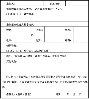 证券代码:002605 证券简称:姚记扑克 公告编号:2014-016 上海姚记扑克股份有限公司 关于董事会换届选举的提示性公告 本公司及董事会全体成员保证信息披露的内容真实、准确、完整,没有虚假记载、误导性陈述或重大遗漏 上海姚记扑克股份有限公司(以下简称"公司"或"本公司")第二届董事会任期于2014年5月29日届满,在换届完成之前公司第二届董事会全体成员将依照有关法律法规的规定继续履行董事职责。为顺利完成董事会的换届选举(以下简称"本次换届选举"),依据《中华人民共和国公司法》(以下简称《公司法》)、中国证券监督管理委员会《关于在上市公司中建立独立董事制度的指导意见》、《上海姚记扑克股份有限公司章程》(以下简称《公司章程》)、《上海姚记扑克股份有限公司董事会议事规则》和《上海姚记扑克股份有限公司董事会提名委员会工作细则》等相关规定,将第三届董事会的组成、董事候选人的推荐、本次换届选举的方式和程序、董事候选人任职资格等事项公告如下: 一、第三届董事会的组成 按照公司现行《公司章程》规定,董事会由7名董事组成,其中独立董事3名,董事任期自公司相关股东大会选举通过之日起计算,任期三年。 二、选举方式 本次董事选举采用累积投票制,即股东大会选举非独立董事或独立董事时,每一股份拥有与拟选非独立董事或独立董事人数相同的表决权,股东拥有的表决权可以集中使用,也可以分开使用。 三、董事候选人的推荐(董事候选人推荐书样本见附件) (一)非独立董事候选人的推荐 本公司董事会及在本公告发布之日单独或合并持有公司3%以上股份的股东可向第二届董事会书面提名推荐第三届董事会非独立董事候选人。单个推荐人推荐的人数不得超过本次拟选非独立董事人数。 (二)独立董事候选人的推荐 本公司董事会、监事会及在本公告发布之日单独或者合并持有公司已发行股份 5%以上的股东可向第二届董事会书面提名推荐第三届董事会独立董事候选人。单个推荐人推荐的人数不得超过本次拟选独立董事人数。 四、本次换届选举的程序 1、推荐人在本公告发布之日起7天内以书面方式向本公司董事会推荐董事候选人并提交相关文件。 2、在上述推荐时间届满后,本公司董事会提名委员会将对推荐的董事候选人进行资格审查,对于符合资格的董事人选,将提交本公司董事会审议。 3、本公司董事会根据提名委员会提交的人选召开会议,确定第三届董事会董事候选人名单,并以提案的方式提请公司股东大会审议。 4、董事候选人应在股东大会召开之前做出书面承诺,同意接受提名,承诺所提供的资料真实、完整并保证当选后妥善履行董事职责,独立董事候选人亦应依法做出相关声明。 5、公司在发布召开关于选举新一届董事会的股东大会通知时,将独立董事候选人的有关材料(包括但不限于提名人声明、候选人声明、独立董事履历表、独立董事资格证书)报送深圳证券交易所进行审核。 五、董事任职资格 (一)非独立董事任职资格 根据《公司法》、《公司章程》及有关法律法规的规定,本公司董事候选人应为自然人,具有与担任董事相适应的工作阅历和经验,并保证有足够的时间和精力妥善履行董事职责。凡具有下述条款所述事实者不能担任本公司董事: 1、无民事行为能力或者限制民事行为能力; 2、因贪污、贿赂、侵占财产、挪用财产或者破坏社会主义市场经济秩序,被判处刑罚,执行期满未逾5年,或者因犯罪被剥夺政治权利,执行期满未逾5年; 3、担任破产清算的公司、企业的董事或者厂长、经理,对该公司、企业的破产负有个人责任的,自该公司、企业破产清算完结之日起未逾3年; 4、担任因违法被吊销营业执照、责令关闭的公司、企业的法定代表人,并负有个人责任的,自该公司、企业被吊销营业执照之日起未逾3年; 5、个人所负数额较大的债务到期未清偿; 6、被中国证监会处以证券市场禁入处罚,期限未满的; 7、法律、行政法规或部门规章规定的其他内容。 (二)独立董事任职资格 本公司独立董事候选人除需具备上述董事任职资格之外,还必须满足下述条件: 1、根据法律、行政法规及其他规定,具备担任上市公司董事的资格; 2、具有相关法律法规及规范性文件所要求的独立性; 3、具备上市公司运作的基本知识,熟悉相关法律、行政法规、规章及规则; 4、具有五年以上法律、经济或者其他履行独立董事职责所必需的工作经验; 5、通过中国证监会或者证券交易所的独立董事培训并获得独立董事资格证书; 6、《公司章程》规定的其他条件; 7、具有下列情形之一的,不得担任本公司的独立董事: (1)在公司或者其附属企业任职的人员及其直系亲属、主要社会关系(直系亲属指配偶、父母、子女等;主要社会关系是指兄弟姐妹、岳父母、儿媳女婿、兄弟姐妹的配偶、配偶的兄弟姐妹等); (2)直接或间接持有公司已发行股份1%以上或者是公司前十名股东中的自然人股东及其直系亲属; (3)在直接或间接持有公司已发行股份5%以上的股东单位或者在公司前五名股东单位任职的人员及其直系亲属; (4)最近一年内曾经具有前三项所列举情形的人员; (5)为公司或其附属企业提供财务、法律、咨询等服务的人员或在相关机构任职的人员; (6)担任独立董事职务的上市公司超过5家的人员; (7)《公司章程》规定的其