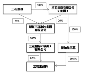 1、重要提示 本年度报告摘要来自年度报告全文,投资者欲了解详细内容,应当仔细阅读同时刊载于深圳证券交易所网站等中国证监会指定网站上的年度报告全文。 公司简介 ■ 2、主要财务数据和股东变化 (1)主要财务数据 公司是否因会计政策变更及会计差错更正等追溯调整或重述以前年度会计数据 □ 是 √ 否 ■ (2)前10名股东持股情况表 ■ (3)以方框图形式披露公司与实际控制人之间的产权及控制关系 ■ 3、管理层讨论与分析 2013年,全球经济开始复苏,重拾升势。空调家电行业市场整体有所转好,市场保持回暖态势。10月份国家变频空调能效新标准的正式实施进一步刺激了高能效标准变频空调市场需求的增长,预计在未来将会继续得到体现。面对家电行业的机遇与挑战,公司依托市场,积极加快推进从“成本领先”到“技术领先”的战略转型,促进产品结构进一步调整优化。同时,加快技改提高生产效率并扩大产能,销售收入稳步增长,其中以电子膨胀阀为代表的节能环保系列产品销售增长显著。另外,报告期内收购后的亚威科各公司纳入公司合并报表范围,对公司整体销售额带来一定增长,随着亚威科项目整合工作的逐步深入推进,其经营状况将不断得到有效改善,实现协同。报告期内,公司实现营业收入52.74亿元,同比上升37.84%;实现营业利润3.55亿元,同比上升10.33%;归属于上市公司股东的净利润3.23亿元,同比上升19.19%。 4、涉及财务报告的相关事项 (1)与上年度财务报告相比,会计政策、会计估计和核算方法发生变化的情况说明 无 (2)报告期内发生重大会计差错更正需追溯重述的情况说明 无 (3)与上年度财务报告相比,合并报表范围发生变化的情况说明 1. 因直接设立或投资等方式而增加子公司的情况说明 (1) 三花亚威科电器设备(芜湖)有限公司 本期,子公司德国三花亚威科电器设备有限公司出资设立三花亚威科电器设备(芜湖)有限公司,于2013年5月24日办妥工商设立登记手续,并取得注册号为340200400007256的《企业法人营业执照》。德国三花亚威科电器设备有限公司持有其100%股权,本公司间接拥有实质控制权,故自该公司成立之日起,将其纳入合并范围。 (2) 青岛三花制冷部件有限公司 本期,公司出资设立青岛三花制冷部件有限公司,于2013年1月11日办妥工商设立登记手续,并取得注册号为370214230100570的《企业法人营业执照》。本公司持有其100%股权,直接拥有实质控制权,故自该公司成立之日起,将其纳入合并范围。 (3) 芜湖三花制冷配件有限公司 本期,子公司中山市三花制冷配件有限公司出资设立芜湖三花制冷配件有限公司,于2013年2月4日办妥工商设立登记手续,并取得注册号为340200000162611的《企业法人营业执照》。中山市三花制冷配件有限公司持有其100%股权,本公司间接拥有实质控制权,故自该公司成立之日起,将其纳入合并范围。 2. 因非同一控制下企业合并而增加营业单位的情况说明 经2012年11月9日公司董事会第四届第十五次会议决议通过,本公司、子公司德国三花亚威科电器设备有限公司与AWECO APPLIANCE SYSTEMS GmbH & Co. KG、AWECO INTERNATIONAL GmbH和Mr. HaraldSchrott签署了附交割条件的《资产出售及转让协议》。该协议经2012年12月29日临时股东大会审议通过。2013年1月31日,各方签署了《交割备忘录》,确认交割条件已经满足或得到豁免,交割实现。德国公证员对交割作了现场公证。 通过该次业务并购,德国三花亚威科电器设备有限公司取得了德国AWECO家用电器业务的经营性资产及负债,包括AWECO APPLIANCE SYSTEMS GmbH & Co. KG所拥有的存货、应收账款、关联债权、机器设备、知识产权、专有技术、不动产、应付账款、关联债务、应付职工薪酬、应付税款和预提费用等和AWECO INTERNATIONAL GmbH所持有的10家企业股权,并承接商业合同和员工雇佣关系等。该次收购构成了非同一控制下的企业合并(业务合并)。 该次业务并购的基准价为2,671.39万欧元。其中,代为支付银行债务2,326.84万欧元,一次性支付现金282.05万欧元,分期支付55万欧元(每期2.5万欧元,共22期),另向Mr.Udo Michael Siebert支付7.50万欧元。同时,基于2013年度和2014年度的德国AWECO家用电器业务的盈利数据(EBITDA,息税折旧摊销前利润),公司或追加支付1欧元~3,352.50万欧元(协议约定,预先开立银行保函750万欧元),或自出售方得到利益补偿(由出售方选择补偿方式:无偿出让一栋厂房或返还现金220万欧元)。 2013年1月28日,本公司为或有支付开立银行保函750万欧元。2013年2月1日,德国三花亚威科电器设备有限公司共支付并购对价2,611.39万欧元,包括:代为归还银行债务2,326.84万欧元,以现金支付一次性收购款282.05万欧元,以现金支付分期收购款第1期计2.5万欧元。 综上,相关资产负债的交割与并购对价的支付发生在2013年1月底和2月初,故本公司将2013年2月1日确定为购买日,并自2013年2月起将德国AWECO家用电器业务纳入合并范围。截至2013年12月31日止,10家企业的股权和标的不动产已完成登记过户手续,商标、专利等知识产权的登记过户手续尚在办理之中。 (4)董事会、监事会对会计师事务所本报告期“非标准审计报告”的说明 不适用