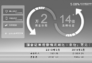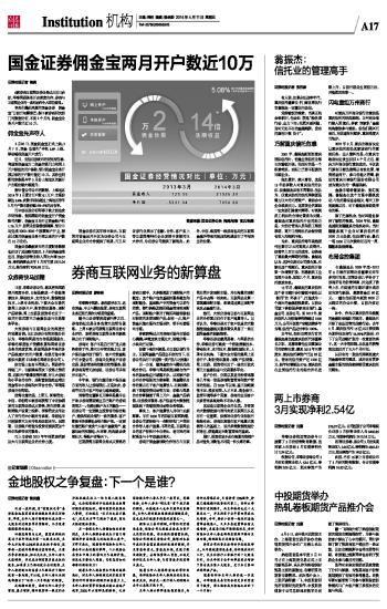 证券时报记者 梅菀 6家券商互联网证券业务试点近日启航,华泰网易甚至开启深度合作,券商与互联网企业的一系列动作令人眼花缭乱。 率先引爆此风潮的国金证券“佣金宝”目前已初露锋芒。据2家券商研究部门的数据分析,不到2个月内,佣金宝业务开户数已近10万。 佣金宝先声夺人 2月20日,国金佣金宝正式上线;3月7日,国金“全能行”手机APP上线,移动端低佣金开户成行。 近日,安信证券发布的研究报告称,考虑到佣金宝万二佣金的吸引力和网上开户极佳的用户体验,预计佣金宝业务开展以来的开户数可能近10万。其作出判断的依据是今年3月份上海地区的新开户市场份额大幅提升。 据中登公司公布的数据,上海地区2014年3月累计开户数6.1万户,市场份额达9.4%,此数字远远超过上海地区常年3月开户数市场份额4%~5%的占有率。 而中信证券分析师邵子钦之前也发布研报称,据其跟踪的佣金宝开户资金账号判断,佣金宝日均开立资金账户约1.76万户,经同业经验数据测算,预计日均完成2000~3000个股票账户开立,据此计算的佣金宝业务开展以来的开户数在10万左右。 国金证券最新发布的月度财务数据也佐证了其战略的成功。3月份佣金宝推出后,国金证券营业收入同比大增29.07倍,净利润则由去年3月的亏损5331.04万元,转为盈利7056.68万元。 众券商快马加鞭 日前,华泰证券公告,称其将和网易展开深度合作,目标是建成一个借助搜索技术、移动技术、支付技术、数据挖掘技术,上承专业机构、下接大众市场的集网上证券开户、财经资讯服务、理财产品销售、网上交易及投资者社区于一体的开放式第三方金融信息与交易服务平台。 大型券商与互联网企业的深度合作尚属首例。长江证券分析师刘俊分析认为,华泰和网易的合作是强强联合,华泰的深度客户资源积累和网络证券业务的先发优势,借助网易多年来的各产品线庞大的用户数量,有望打造中国版乐天集团(日本著名网络证券公司)。 但市场上也有不同观点。“网易作为传统门户,在新媒体围攻下没落之势明显,活跃用户数量值得怀疑,并且大券商和小平台的合作,其财富创造效应难比国金等中小券商和大平台合作。”华南某券商分析师说。 值得注意的是,上周五,国泰君安、中信、华创等6家券商获得了中证协颁发的互联网证券试点资格,将在消费、理财类账户设置上松绑,国泰君安去年加入了央行的大小额支付系统,华创也早已控股第三方支付机构证联支付。远期看,证券账户将能为投资者提供更加个性化和多样化的服务。 而上市券商2013年年报更表明要加大与互联网企业的合作力度。 国金证券在其年报中表示,互联网的普遍运用不仅为证券公司与互联网企业的合作提供了机遇,而且向证券行业展示了创新、合作、客户至上等互联网精神在企业发展中发挥的巨大作用,为证券公司提供了新视角。此外,中信、海通等一线券商也均把互联网金融所带来的挑战和机遇放在了年报突出的位置。 本版导读: