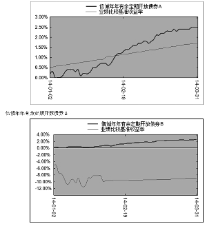 基金管理人:信诚基金管理有限公司 基金托管人:中国建设银行股份有限公司 报告送出日期:2014年4月19日 §1 重要提示 基金管理人的董事会及董事保证本报告所载资料不存在虚假记载、误导性陈述或重大遗漏,并对其内容的真实性、准确性和完整性承担个别及连带责任。 基金托管人中国银行股份有限公司根据本基金合同规定,于2014年4月16日复核了本报告中的财务指标、净值表现和投资组合报告等内容,保证复核内容不存在虚假记载、误导性陈述或者重大遗漏。 基金管理人承诺以诚实信用、勤勉尽责的原则管理和运用基金资产,但不保证基金一定盈利。 基金的过往业绩并不代表其未来表现。投资有风险,投资者在作出投资决策前应仔细阅读本基金的招募说明书。 本报告中财务资料未经审计。 本报告期自2014年1月1日起至3月31日止。 §2 基金产品概况 ■ §3 主要财务指标和基金净值表现 3.1 主要财务指标 单位:人民币元 ■ 注:1、上述基金业绩指标不包括持有人认购或交易基金的各项费用,计入费用后实际收益水平要低于所列数字。 2、本期已实现收益指基金本期利息收入、投资收益、其他收入(不含公允价值变动收益)扣除相关费用后的余额,本期利润为本期已实现收益加上本期公允价值变动收益。 3.2 基金净值表现 3.2.1 本报告期基金份额净值增长率及其与同期业绩比较基准收益率的比较 信诚年年有余定期开放债券A ■ 信诚年年有余定期开放债券B ■ 3.2.2 自基金合同生效以来基金累计净值增长率变动及其与同期业绩比较基准收益率变动的比较 信诚年年有余定期开放债券A ■ 注:1.本基金合同生效日为2013年11月27日,运作未满一年。建仓期自2013年11月27日至2014年5月27日,建仓期内资产配置比例符合本基金基金合同规定。 §4 管理人报告 4.1 基金经理(或基金经理小组)简介 ■ 注:1.上述任职日期、离任日期根据本基金管理人对外披露的任免日期填写。 2.证券从业的含义遵从行业协会《证券业从业人员资格管理办法》的相关规定。 4.2 管理人对报告期内本基金运作遵规守信情况的说明 在本报告期内,本基金管理人严格按照《证券投资基金法》和其他相关法律法规的规定以及《信诚年年有余定期开放债券型证券投资基金基金合同》、《信诚年年有余定期开放债券型证券投资基金招募说明书》的约定,本着诚实信用、勤勉尽职的原则管理和运用基金财产。本基金管理人通过不断完善法人治理结构和内部控制制度,加强内部管理,规范基金运作。本报告期内,基金运作合法合规,没有发生损害基金份额持有人利益的行为。 4.3 公平交易专项说明 4.3.1 公平交易制度的执行情况 根据中国证监会颁布的《证券投资基金管理公司公平交易制度指导意见》,以及公司拟定的《信诚基金公平交易管理制度v1.2》,公司采取了一系列的行动实际落实公平交易管理的各项要求。各部门在公平交易执行中各司其职,投资研究前端不断完善研究方法和投资决策流程,确保各投资组合享有公平的投资决策机会,建立公平交易的制度环境;交易环节加强交易执行的内部控制,利用恒生交易系统公平交易相关程序,及其它的流程控制,确保不同基金在一、二级市场对同一证券交易时的公平;公司同时不断完善和改进公平交易分析系统,在事后加以了严格的行为监控,分析评估以及报告与信息披露。当期公司整体公平交易制度执行情况良好,未发现有违背公平交易的相关情况。 4.3.2 异常交易行为的专项说明 本报告期内,未发现本基金有可能导致不公平交易和利益输送的异常交易。报告期内,未出现参与交易所公开竞价同日反向交易成交较少的单边交易量超过该证券当日成交量5%的交易。 4.4 报告期内基金的投资策略和运作分析 一季度经济增长偏弱,通胀保持较低水平,在总需求仍然偏弱的情形下,通胀压力不大。一季度货币政策中性,由于年初的季节性效应,市场流动性宽松,资金利率下降到较低水平,债市小幅回升,标普全债指数上涨1.4%。一季度产业债信用风险较为突出,部分行业和领域的企业经营出现恶化,甚至有个别实质性违约风险案例出现,信用风险较高的行业和公司的债券收益率大幅震荡。 根据本基金封闭期一年的特点,采取久期匹配策略,持仓以剩余期限在1年左右的企业债、公司债、短期融资券等信用债为主。一季度短久期信用债收益率较高,久期短波动风险小,相对于长期信用债而言更具性价比。本基金抓住去年年末协议存款利率高的投资时机,较多地参与了协议存款的投资,提高组合收益。利率债包括国债和政策性金融债等,在中性货币政策下,难有趋势性机会,操作风险较大,故本基金未参与利率债的投资。本基金对可转债投资较为审慎,未参与。一季度本基金在风险管理上,特别注重信用风险管理,通过严格的内部信用评级体系,甄别信用风险,规避负债率高、经营性现金流持续为负和经营亏损的公司发行的债券,以及信用风险较为突出的行业的债券,如钢铁、电解铝、煤化工等行业的债券。 4.5 报告期内基金的业绩表现 本报告期基金份额净值A和B增长率分别为2.50%,2.40%,同期业绩比较基准收益率为1.24%,基金表现超越基准分别为1.26,1.16个百分点。 §5 投资组合报告 5.1 报告期末基金资产组合情况 ■ 5.2 报告期末按行业分类的股票投资组合 本基金本报告期末未持有股票投资。 5