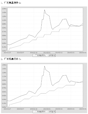 基金管理人:广发基金管理有限公司 基金托管人:中国工商银行股份有限公司 报告送出日期:二〇一四年四月二十一日 §1 重要提示 基金管理人的董事会及董事保证本报告所载资料不存在虚假记载、误导性陈述或重大遗漏,并对其内容的真实性、准确性和完整性承担个别及连带责任。 基金托管人中国工商银行股份有限公司根据本基金合同规定,于2014年4月16日复核了本报告中的财务指标、净值表现和投资组合报告等内容,保证复核内容不存在虚假记载、误导性陈述或者重大遗漏。 基金管理人承诺以诚实信用、勤勉尽责的原则管理和运用基金资产,但不保证基金一定盈利。 基金的过往业绩并不代表其未来表现。投资有风险,投资者在作出投资决策前应仔细阅读本基金的招募说明书。 本报告中财务资料未经审计。 本报告期自2014年1月27日起至3月31日止。 §2 基金产品概况 ■ §3 主要财务指标和基金净值表现 3.1 主要财务指标 单位:人民币元 ■ 注:(1)本基金合同2014年1月27日生效。 (2)所述基金财务指标不包括持有人认购和交易基金的各项费用,计入费用后实际收益水平要低于所列数字。 (3)本期已实现收益指基金本期利息收入、投资收益、其他收入(不含公允价值变动收益)扣除相关费用后的余额,本期利润为本期已实现收益加上本期公允价值变动收益。 3.2 基金净值表现 3.2.1本报告期基金份额净值增长率及其与同期业绩比较基准收益率的比较 1、广发集鑫债券A: ■ 2、广发集鑫债券C: ■ 3.2.2 自基金合同生效以来基金累计净值增长率变动及其与同期业绩比较基准收益率变动的比较 广发集鑫债券型证券投资基金 累计净值增长率与业绩比较基准收益率的历史走势对比图 (2014年1月27日至2014年3月31日) ■ 注:(1)本基金合同生效日期为2014年1月27日,至披露时点未满一年。 (2)本基金建仓期为基金合同生效后6个月,至披露时点本基金仍处于建仓期。 §4 管理人报告 4.1 基金经理(或基金经理小组)简介 ■ 注:1.“任职日期”和“离职日期”指公司公告聘任或解聘日期。 2.证券从业的含义遵从行业协会《证券业从业人员资格管理办法》的相关规定。 4.2报告期内本基金运作遵规守信情况说明 本报告期内,本基金管理人严格遵守《中华人民共和国证券投资基金法》及其配套法规、《广发集鑫债券型证券投资基金基金合同》和其他有关法律法规的规定,本着诚实信用、勤勉尽责的原则管理和运用基金资产,在严格控制风险的基础上,为基金份额持有人谋求最大利益。本报告期内,基金运作合法合规,无损害基金持有人利益的行为,基金的投资管理符合有关法规及基金合同的规定。 4.3 公平交易专项说明 4.3.1 公平交易制度的执行情况 公司通过建立科学、制衡的投资决策体系,加强交易分配环节的内部控制,并通过实时的行为监控与及时的分析评估,保证公平交易原则的实现。 在投资决策的内部控制方面,公司制度规定投资组合投资的股票必须来源于备选股票库,重点投资的股票必须来源于核心股票库。公司建立了严格的投资授权制度,投资组合经理在授权范围内可以自主决策,超过投资权限的操作需要经过严格的审批程序。在交易过程中,中央交易部按照“时间优先、价格优先、比例分配、综合平衡”的原则,公平分配投资指令。监察稽核部风险控制岗通过投资交易系统对投资交易过程进行实时监控及预警,实现投资风险的事中风险控制;稽核岗通过对投资、研究及交易等全流程的独立监察稽核,实现投资风险的事后控制。 本报告期内,上述公平交易制度总体执行情况良好,不同的投资组合受到了公平对待,未发生任何不公平的交易事项。 4.3.2 异常交易行为的专项说明 本公司原则上禁止不同投资组合之间(完全按照有关指数的构成比例进行证券投资的投资组合除外)或同一投资组合在同一交易日内进行反向交易。如果因应对大额赎回等特殊情况需要进行反向交易的,则需经公司领导严格审批并留痕备查。 本报告期内,本投资组合与本公司管理的其他投资组合未发生过同日反向交易的情况。 4.4 报告期内基金的投资策略和业绩表现说明 4.4.1报告期内基金投资策略和运作分析 2014年1季度,经济基本面出现明显衰退迹象,2月通胀率一度跌破2%,宏观数据方面出现了增长和通胀的双回落。在这样的背景下,央行一改之前偏紧的货币操作,通过扩大SLO的使用范围、对回购利率进行窗口指导等方式维稳资金面,资金利率创出近一年内的新低。 中长期利率债和高等级信用债的收益率整体走出V型行情,而中低等级信用债分化严重,超日以及多家中小企业私募债无法偿付利息的事件加重了市场对于部分民企违约风险的担忧,民企以及信用评级偏弱的城投和国企发行的信用债遭受严重抛压。可转债方面,整体延续震荡行情,缺乏系统性行情,只有部分个券,比如石化、隧道、东华等出现了10%以上的绝对收益机会。 本基金成立后的3个月内处于封闭运作期,期间主要以银行定存作为配置主体。由于银行间债券账户在运作期内尚未开立,本基金的债券仓位以交易所短期债券为主,整体债券配置比例很低。 4.4.2报告期内基金的业绩表现 广发集鑫A类本报告期净值增长率为1.00%,业绩比较基准收益率为0.94%;广发集鑫B类本报告期净值增长率为0.90%,业绩比较基准收益率为0.94%。 4.5管理人对宏观经济、证券