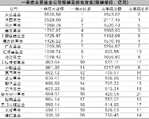 证券时报记者 朱景锋 今日公布完毕的基金一季报显示,货币基金成为基金公司乃至整个基金行业规模变动的决定力量。在股市低迷、各类基金普遍净赎回的情况下,不少基金公司依靠货币基金规模猛增,排名扶摇直上,互联网金融成行业洗牌的幕后推手。 七年来基金公司规模老大首次易主!截至一季末,天弘基金依靠余额宝总规模达到5536.56亿元,一举超越华夏基金成为公募管理规模最大的基金公司,华夏基金以3629亿元管理规模排名第二,自2007年以来首次让出头把交椅,不过,依靠华夏活期通和微信理财通两个货币基金王牌,华夏基金一季度规模增加1182亿,是天弘基金之外规模增长最多的基金公司。 季报显示,华夏活期通对接的华夏现金增利基金一季度规模大增523亿至960.47亿元,直销能力业内首屈一指,在微信理财通上线的华夏财富宝货币基金规模达到821.65亿元,这两只货币基金合计规模即高达1782亿元,吸金能力仅次于余额宝。 南方基金、嘉实基金和工银瑞信分列第三到第五名,公募规模分别达1980亿、1767亿和1725亿元,和去年底相比,南方基金排名上升两位,工银瑞信则上升了三位,首次跻身行业前五。南方基金旗下南方现金增利一季度规模大增462亿元至983亿元,成仅次于余额宝的规模第二大货币基金。工银瑞信则有多只货币基金规模暴增。 汇添富、华宝兴业等公司同样依靠货基实现规模和排名大幅跃升。其中依靠和网易理财、苏宁易付宝和民生银行直销银行民生如意宝对接的汇添富现金宝货币基金净申购206亿份,汇添富一季度规模增加至1030亿元,从去年底的第13名上升到第8名。华宝兴业基金则依靠T+0货基华宝添益规模大增184亿元至604.97亿元,排名上升8个名次,成一季度规模排名上升最快的公司。 传统大佬易方达基金、广发基金和博时基金仍然位居十大基金公司之列,公募规模均超过1000亿元,上投摩根基金则以863.64亿元的规模排名第十位。 而一些大型公司则经历了规模的大幅缩水和排名的显著下降,其中有6家公司规模缩水超百亿元,排名下滑一个到8个名次不等,一些传统大牌基金公司甚至即将跌出前20名之列。 本版导读: