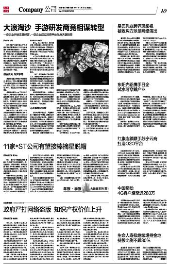 大浪淘沙 手游研发商竞相谋转型一些企业开始注重经营,一些企业成立投资平台化身天使投资 2014-04-23 来源:证券时报网 作者:邝龙