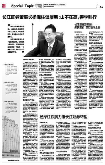 长江证券董事长杨泽柱谈履新:山不在高,善学则行 2014-04-23 来源:证券时报网 作者:卢晓利 曾灿