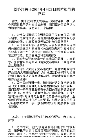 创势翔纷争继续 董事长再回应 2014-04-24 来源:证券时报网 作者:刘明