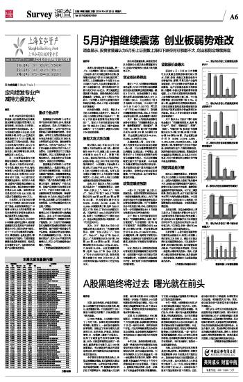 5月沪指继续震荡 创业板弱势难改调查显示,投资者普遍认为5月份上证指数上涨和下跌空间可能都不大,创业板则会继续探底 2014-04-26 来源:证券时报网 作者:谢祖平