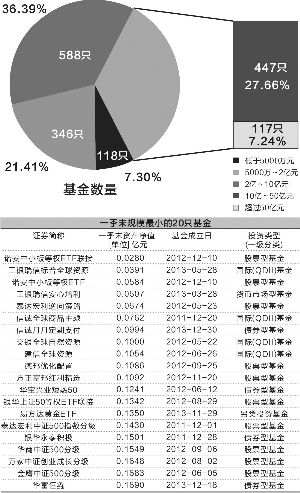 在普遍赎回和股市低迷的情况下,迷你基金阵营在今年一季度迅速壮大,根据中国基金报记者统计,在截至一季末的1616只基金中,规模不足2亿元的基金多达464只或28.71%,更有118只跌破5000万元警戒线。 业内人士认为,基金规模过小带来了费用负担高、运营成本高等诸多问题,也对投资也生了不利影响,迷你基金的处置已经成为基金业的重大难题。去年底以来大成沪市500ETF联接等多只基金主动转型寻找出路只是为迷你基金转型打开了一扇窗,从美国等成熟市场基金发展历程看,清盘合并或是迷你基金的主要出路。 迷你基金猛增 最小基金仅280万元 基金一季报显示,一季度除货币基金以外的各类基金整体净赎回,再加上股市低迷、基金净值缩水,迷你基金阵容迅速扩大。 统计显示,截至今年一季末,1616只基金合计净值规模为3.45万亿元,平均单只基金规模为21.35亿元,其中净值规模跌破5000万元警戒线的多达118只,比去年底的69只大幅增长71%,规模低于5000万元基金的占比也从去年底的4.46%上升到一季末的7.3%。此外,一季末规模低于2亿元的基金也多达464只,占基金总数的28.71%,较去年底的422只、占比27.3%明显增加。 从基金公司看,在84家基金公司中,旗下规模不足5000万元基金数量达到或超过3只的共有16家,交银施罗德、信诚、景顺长城和上投摩根等4家基金公司旗下分别有7只、6只、5只和5只;旗下规模不足2亿元基金数量达到或超过10只的共有15家,华安、国泰、大成等公司旗下分别有17只、16只和15只。显然,迷你基金已经成为行业普遍现象。 从单只基金看,一季末共有7只基金规模不足1000万元,其中诺安中小板等权ETF联接基金规模最小,只有280万元,公开信息显示,该联接基金于2012年12月10日成立,首发规模为4.09亿元,去年该基金开放赎回后规模一路缩水,到去年底只有2351万元,但今年一季度该基金继续遭遇大赎回,单季度份额缩水87.8%。工银瑞信标普全球资源和诺安中小板等权ETF一季末规模分别只有391万元和584万元,分别为规模最小QDII和ETF。工银瑞信安心增利A和泰达宏利逆向策略则分别成为规模最小的货币基金和主动股票基金,一季末规模分别为607万元和674万元。 从迷你基金的类型分布看,QDII基金、ETF及其联接基金、分级基金和普通指数型基金是重灾区。从成立时间看,一季末规模不足5000万元的118只基金中,有57只是在2012年成立的,2013年成立的则有23只,这些基金多数成立规模都不大,开放赎回后遭遇资金大规模流出,再加上近年来大盘股表现低迷,最终快速沦为迷你基金。 转型尝试开启 清盘合并或是主要出路 在不少业内人士看来,近年来市场环境不佳而基金公司盲目发行新基金是导致迷你基金愈加严重的主要原因,基金公司应该集体反思自己的产品发行策略。按照目前施行的有关法规,当基金规模连续低于5000万元时,基金公司需要向证监会备案并提出解决方案。 已经有基金公司率先为迷你基金寻找出路,通过改变基金类型和投资范围、投资策略,让迷你基金改头换面。目前,陆续已有大成中证500沪市ETF联接基金转型为大成健康产业股票基金、长盛同祥泛资源主题基金转型为长盛战略新兴产业基金、大成消费指数基金转型为大成消费主题股票基金、鹏华21天理财债基转型为鹏华月月发理财债基、万家14天理财债基转型为万家日日薪货币、华宝兴业中证短融50指数债基转型为华宝兴业活期通货币,以及长信中短债转型为长信利稳纯债基金。真正的直接清盘或合并的情况并未出现。 上海某基金公司人士向记者表示,事实上很多基金可以直接清盘,没有继续运作的必要,但没有公司愿意做第一个,担心清盘会对公司品牌造成负面影响。去年业内一直希望监管层给出统一操作指引,但到目前并未有说法。不过,日前有消息传出,管理层拟制定统一的基金合并清盘操作办法并在业内征求意见,如果该办法出台,将大大推动迷你基金处置进程。 当一只基金已经不再适应市场需求时,清盘或许是最好的选择。上海证券基金评价研究中心代宏坤表示,在高度竞争的美国基金行业,基金清盘司空见惯,基金公司一方面设立新基金来满足投资者需要,另一方面并购和清算那些投资者兴趣不大的基金。据他统计,2011年美国新成立的共同基金有580只,进行合并的基金有292只,清盘的基金数量达到了194只。 代宏坤预计,基金清盘在不久的将来会取得实质性进展。他认为,在基金设立变得相对容易后,基金公司没有太多动机来维护那些面临清盘的基金。相反,可能会更倾向于结束那些业绩很差,或投资策略投资范围已不适应市场的基金。 本版导读: