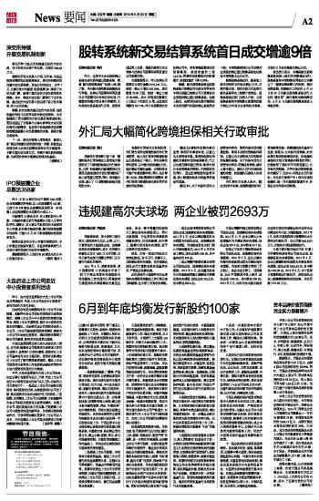 6月到年底均衡发行新股约100家 2014-05-20 来源:证券时报网 作者: