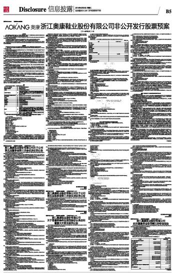 股票代码:603001 股票简称:奥康国际 公告编号:临2014-013 浙江奥康鞋业股份有限公司关于公司 第五届董事会第三次会议决议的公告 本公司董事会及全体董事保证本公告内容不存在任何虚假记载、误导性陈述或者重大遗漏,并对其内容的真实性、准确性和完整性承担个别及连带责任。 浙江奥康鞋业股份有限公司(以下简称“公司”)第五届董事会第三次会议于2014年5月16日在浙江省永嘉县千石奥康工业园公司视频会议室,以现场结合通讯方式召开。应参会董事9名,实际参会董事9名。会议的召集和召开程序符合《中华人民共和国公司法》和《公司章程》的有关规定,会议合法有效。 会议由董事长王振滔先生主持,关联董事回避了涉及关联交易议案的表决。经与会董事审议并以记名投票的方式通过了以下决议: 一、审议并通过《关于公司符合非公开发行股票条件的议案》 根据《公司法》、《证券法》和中国证监会《上市公司证券发行管理办法》和《上市公司非公开发行股票实施细则》等法律、法规、规范性文件关于非公开发行股票的有关规定,公司董事会结合公司实际情况,对照上市公司非公开发行股票相关资格、条件的要求进行认真自查,认为公司已经符合非公开发行股票的条件。 由于本议案涉及关联交易,关联董事王振滔先生、王进权先生、余雄平先生、徐旭亮先生、周盘山先生回避表决,由4名非关联董事进行表决。 表决情况:4票赞成;0票弃权;0票反对。 本议案尚需提交公司2013年年度股东大会审议,关联股东将回避表决。 二、审议并通过《关于公司非公开发行股票方案的议案》 由于本议案涉及关联交易,关联董事王振滔先生、王进权先生、余雄平先生、徐旭亮先生、周盘山先生回避表决,由4名非关联董事进行表决。 公司本次非公开发行股票方案涉及的议案需逐条审议,具体内容如下: 1、发行股票的种类和面值 本次发行的股票种类为境内上市人民币普通股(A股),每股面值为人民币1.00元。 表决情况:4票赞成;0票弃权;0票反对。 2、发行方式和发行时间 本次发行采用非公开发行的方式。公司将在获得中国证监会核准后6个月内选择适当时机向特定对象发行股票。 表决情况:4票赞成;0票弃权;0票反对。 3、发行数量及发行规模 本次非公开发行股票数量为3,000万股。若公司股票在定价基准日至发行日期间有派息/现金分红、送股、资本公积金转增股本等除权、除息事项的,发行数量将根据募集资金总额和调整后的发行价格做相应调整,除非中国证监会核准本次发行的文件另有规定。如本次非公开发行的股份总数因监管政策变化或根据发行核准文件的要求等情况予以调减的,则各发行对象认购的股份数量将按照各自原认购的股份数量占本次非公开发行原股份总数的比例相应调减。 表决情况:4票赞成;0票弃权;0票反对。 4、发行对象及认购方式 本次非公开发行股票的发行对象为奥康投资有限公司(以下简称“奥康投资”)和拟由汇添富基金管理股份有限公司(以下简称“汇添富”)担任资产管理人的汇添富-奥康资产管理计划(以下简称“汇康资产管理计划”)。发行对象将分别与公司签署附生效条件的股份认购合同。其中:奥康投资认购数量为900万股;汇康资产管理计划认购数量为2,100万股。奥康投资和汇康资产管理计划以同一价格认购本次非公开发行的股票,且均为现金认购。 表决情况:4票赞成;0票弃权;0票反对。 5、定价原则及发行价格 本次非公开发行股票的发行价格不低于定价基准日前二十个交易日公司股票均价的百分之九十,即不低于2014年5月20日前二十个交易日公司股票交易均价14.86元/股的百分之九十。经董事会讨论决定,本次发行股票价格为13.39元/股。若本公司股票在定价基准日至发行日期间有派息/现金分红、送股、资本公积金转增股本等除权、除息事项的,将对发行价格作相应调整。 表决情况:4票赞成;0票弃权;0票反对。 6、本次发行股票的限售期 所有特定对象认购本次发行的股份自发行结束之日起36个月内不得转让。 表决情况:4票赞成;0票弃权;0票反对。 7、募集资金总额及用途 本次非公开发行股票募集资金总额为40,170万元(含发行费用),扣除发行费用后的净额将用于奥康国际馆建设项目。 表决情况:4票赞成;0票弃权;0票反对。 8、上市地 本次发行的股票限售期满后,将申请在上海证券交易所上市交易。 表决情况:4票赞成;0票弃权;0票反对。 9、滚存未分配利润的安排 本次非公开发行前公司滚存未分配利润将由本次发行完成后的新老股东共享。 表决情况:4票赞成;0票弃权;0票反对。 10、决议的有效期限 本次非公开发行股票决议的有效期为发行方案提交股东大会审议通过之日起24个月。 表决情况:4票赞成;0票弃权;0票反对。 公司本次非公开发行股票的方案经公司股东大会审议通过后将按照有关程序向中国证监会申报,并最终以中国证监会核准的方案为准。 本议案尚需提交公司2013年年度股东大会逐项审议,关联股东将回避表决。 三、审议并通过《关于<浙江奥康鞋业股份有限公司非公开发行股票预案>的议案》 公司拟向奥康投资及汇康资产管理计划非公开发行股票。根据中国证监会《上市公司非公开发行股票实施细则》及《公开发行证券的公司信息披露内容与格式准则第25 号—上市公司非公开发行股票预案和发行情况报告