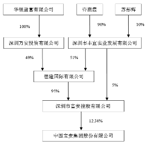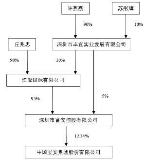 本公司及董事局全体成员保证信息披露的内容真实、准确、完整,没有虚假记载、误导性陈述或者重大遗漏。 近日,中国宝安集团股份有限公司(以下简称"本公司"或"上市公司")接到了第一大股东深圳市富安控股有限公司(以下简称"富安控股")关于其控股股东恒隆国际有限公司(以下简称"恒隆国际")的股东权益变动情况的通知,获悉恒隆国际原控股股东丘兆忠先生将其持有的恒隆国际全部股权分别协议转让给深圳市丰宜实业发展有限公司(以下简称"丰宜实业")和深圳万安投资有限公司(以下简称"万安投资"),其中丰宜实业以人民币1230万受让其41%股权,万安投资以人民币1470万元受让其49%股权。 本次股权变动前后,本公司与富安控股之上层股东的股权关系对比如下: 1、变更前 ■ 2、变更后 ■ 本次恒隆国际股东权益变动导致丰宜实业成为本公司第一大股东富安控股之控股股东恒隆国际的控制性股东。丰宜实业本次增持恒隆国际股权是为了满足自身投资发展需要,无在未来12个月内改变上市公司主营业务的计划;无在未来12个月内对上市公司或其子公司的资产和业务进行出售、合并、与他人合资或合作的计划;无改变上市公司现任董事会或高级管理人员组成的计划;无对上市公司公司章程进行修改的计划;亦无其他对上市公司业务和组织结构有重大影响的计划。 特此公告 中国宝安集团股份有限公司董事局 二〇一四年五月二十七日 本版导读: