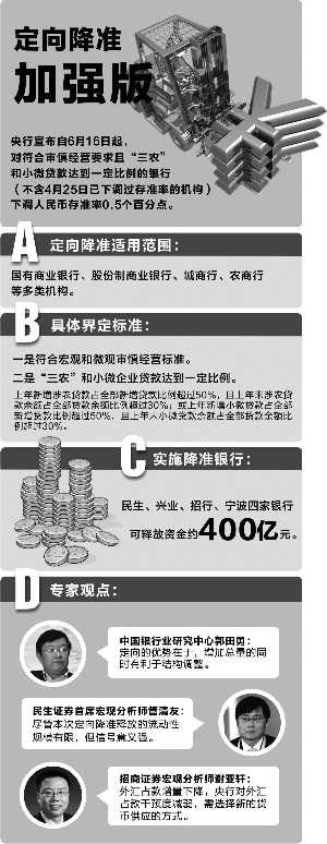 证券时报记者 蔡恺 实习记者 孙璐璐 昨日,部分股份制银行宣布获批定向降准,市场上关于股份制银行是否被纳入定向降准行列的疑惑被消除。但是,央行仍强调并没有扩大定向降准的范围。专家预计,央行次轮定向降准可能将惠及更多股份制银行。 约释放400亿流动性 就在6月16日央行正式启动对符合条件的城商行、农商行、农村合作银行的定向降准之际,部分股份制银行也确认加入定向降准之列。 昨日民生、兴业、招商、宁波四家股份制银行均向媒体表示,已接到央行分支机构申请降准获批通知,从16日起,存款准备金率由原来18%下降为17.5%。其中,招商银行和兴业银行均在上交所披露了该信息。 昨日下午,获批降准的几家银行股价均有不同程度上涨。公开数据显示,四家股份制银行降准后预计释放流动性约400亿元。 证券时报记者从其他股份制银行了解到,除上述四家银行获批定向降准外,目前华夏、浦发、广发等银行相关部门均表示暂时未有这方面消息。不过市场人士预计,一些符合条件的银行也正在争取。平安银行就表示,定向降准政策将引导上市银行的贷款向小微及“三农”倾斜,与该行发展战略相符,该行正在积极准备申请。 证券时报记者梳理央行定向降准的时间表发现,从今年4月16日国务院提出对县域涉农金融机构定向降准,再到5月底国务院提出加大定向降准力度,央行应国务院要求在不到两个月时间里发动了两轮定向降准,惠及机构包括农村金融机构和股份制银行。 央行回应: 定向降准未扩大 不过,央行昨晚通过官方微博称,“定向降准范围没有扩大”,并强调定向降准的范围是“符合审慎经营要求且‘三农’和小微企业贷款达到一定比例的商业银行,包括国有商业银行、股份制商业银行、城商行、农商行等多类机构”。 据证券时报记者了解,在获批之前,民生、兴业、招商等股份制银行均以小微贷款特色向央行申请定向降准,但由于小微企业的认定标准存在差异,中间经历了沟通过程。 6月9日央行宣布将执行第二轮定向降准,规定小微贷款领域的商业银行降准条件为:上年新增小微贷款占全部新增贷款比例超过50%,且上年末小微贷款余额占全部贷款余额的比例超过30%。 不过,按照民生银行2013年年报数据计算,该行2013年新增小微贷款占全部新增贷款比例46.28%,小微贷款余额占比25.7%,均未达到央行规定的“50%和30%”两个指标。 对此,中金公司研究团队表示,对于小微贷款,各行的统计口径不一,部分银行与央行主动沟通,调整后在统一小微贷款口径下,民生、兴业满足此次降准要求。兴业银行相关人士昨日就此事对记者强调,该行符合央行规定的“50%和30%”的小微贷款比例标准。 据一位股份制银行人士介绍,大部分银行统计小微贷款的“行标”,是贷款额度在500万元以下的经营性贷款;然而,2011年6月由四部委联合发布的《中小企业划型标准规定》,则从企业从业人员、营业收入、资产总额等指标确定小微企业的“国标”,两者存在一定差异。然而,这次是由商业银行通过主动沟通争取到降准政策,也让不少业内人士感到意外。 民生证券研究院首席宏观分析师管清友认为,尽管本次定向降准释放的流动性规模有限,但信号意义强,有利于鼓励和引导其他金融机构更多将信贷资源配置到中小微企业和其他有利于调结构的领域。兴业银行相关人士对记者表示,本轮降准后获得的资金,将严格遵守国家宏观调控政策,落实金融服务实体经济,信贷重点投向小微、绿色金融。 未来或更多银行受惠 民生证券预计,加上本次股份制银行释放的400亿元流动性,央行自4月开始的定向降准已释放流动性约1900亿元。这也引起了市场对央行动机的高度关注,有分析称,外汇占款的下降或许是央行加大定向降准力度的一大因素。 央行日前公布的数据显示,5月外汇占款仅增加387亿元人民币,较4月下降782亿元,降幅高达66.9%。招商证券宏观分析师谢亚轩对证券时报记者表示,过去外汇占款是供应基础货币的主要方式,央行可以选择的货币政策工具较少且较为被动。 此外,外汇占款的增量乃至基础货币的增量主要流入大型商业银行。但是,汇改后外汇占款增量下降,央行对外汇占款的干预度减弱,需选择新的货币供应的方式,定向降准、再贷款就成为央行的工具,这也反映了央行货币政策的有效性、主动性增强。 中央财经大学中国银行业研究中心主任郭田勇认为,就释放流动性而言,多次定向降准释放的货币甚至会超过全面降准,且定向的优势在于增加总量的同时,有利于结构调整。 管清友还预计,央行可能会加大定向宽松力度,未来会有更多符合条件的股份制银行受益。 本版导读:
