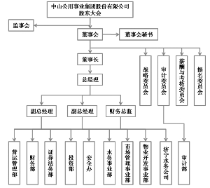 (上接B9版) 1998年5月20日公司实施1997年度分红派息方案,以1997年末总股本6,900万股为基数,向全体股东每10股送1股红股、派1元人民币现金(含税,扣税后个人股东实际每10股送1股红股并派0.7元现金),分红前总股本为6,900万股,分红派息后总股本增至7,590万股。 (三)2000年1月公司内部职工股上市流通 2000年1月18日,公司1,113.2万股内部职工股上市流通。 (四)2000年4月公司公积金转股后的股本变化情况 2000年4月17日公司实施1999年度公积金转股方案,以1999年末总股本7,590万股为基数,向全体股东每10股转增8股,方案实施后总股本增至13,662万股。 (五)2002年5月公司送股以及资本公积金转增后的股本变化情况 经2001年度股东大会审议、通过,2002年5月29日公司实施2001年度分红派息及公积金转股方案,以2001年末总股本13,662万股为基数,向全体股东按每10 股送红股0.5股并派发现金红利0.3元(含税);同时按10:6的比例转增股本。本次分红转增前总股本为13,662万股,方案实施后总股本增至22,542.3万股。 (六)2006年公司实施股权分置改革后的股本结构变动情况 2006年1月10日,公司披露了股权分置改革方案实施公告,本次股权分置改革方案的主要内容为:方案实施股份变更登记日登记在册的全体流通股股东每持有10股流通股份将获得公司非流通股股东支付的3.2股对价股份。该方案实施后公司总股本未变化,仍为225,423,000股,股本结构发生变化,其中无限售流通股为122,990,804股,有限售流通股为102,432,196股。改革方案实施后股本结构变动如下表所示: ■ (七)2008年公用科技换股吸收合并公用集团暨新增股份收购供水资产后,公司总股本由225,423,000股变更598,987,089股,具体详见本节中的“三、公司重大资产重组情况” (八)2012年7月,公司送股后的股本变化情况 经公司2011年年度股东大会审议通过,2012年7月公司实施2011年度利润分配方案,以2011年末总股本598,987,089股为基数,向全体股东每10股送3股股份,每10股派发现金红利1元(含税)。本次实施送股后,公司总股本变更为778,683,215股。 三、公司重大资产重组情况 (一)2000年公司实施的重大资产重组情况 2000年1月27日,根据中华人民共和国财政部财管字[1999]320号文《关于转让佛山市兴华集团股份有限公司国家股股权有关问题的批复》和证监会证监函[1999]303号《关于同意豁免中山公用事业集团有限公司要约收购“佛山兴华”股票义务的函》,兴华集团将其所持本公司国家股2,955.04万股(占总股本的38.93%)全部转让给公用集团。兴华集团用转让所得的股权转让金中的实物资产偿还其所欠佛山兴华的债务。该交易行为完成后,公用集团的优质资产――以经营农贸、水产、百货等为主的综合市场注入到佛山兴华中,兴华集团不再持有佛山兴华的股份,公用集团成为佛山兴华的控股股东。2000年9月21日,公司名称由“佛山市兴华集团股份有限公司”更改为“中山公用科技股份有限公司”。 (二)2008年公用科技换股吸收合并公用集团暨新增股份收购供水资产 经国务院国有资产监督管理委员会2007年12月24日国资产权[2007]1556号文和中国证券监督管理委员会2008年4月24日证监许可[2008]584号文批准,公司吸收合并公用集团及向五家乡镇水厂(古镇水厂、三乡水务、东凤水厂、东升供水、板芙供水)定向发行股份购买资产,新增发行438,457,067股A股,同时注销公用集团于吸收合并基准日持有的公司64,892,978股A股。公司于2008年7月14日在广东省工商行政管理局取得新的《企业法人营业执照》,注册号为440000000047235,注册资本为人民币伍亿玖仟捌佰玖拾捌万柒仟零捌拾玖元(RMB598,987,089.00元)。2008年8月6日,公司名称由“中山公用科技股份有限公司”更改为“中山公用事业集团股份有限公司”。公用科技换股吸收合并公用集团暨新增股份收购供水资产后的股本变化情况如下表所示: ■ 四、公司股本结构及前十名股东持股情况 (一)公司股本结构 截至2013年12月31日,公司股本结构如下表所示: ■ (二)前十名股东持股情况 截至2013年12月31日,公司前10名股东持股情况如下表所示: ■ 五、公司权益投资情况和组织结构 (一)公司组织结构 公司建立了健全的法人治理结构,股东大会、董事会、监事会和管理层独立运行,设置了与公司生产经营相适应的组织职能机构,制定了一系列的制度规定等,使法人治理的框架更趋合理和完善,决策机制更加公开、透明、高效,保障了公司的日常运营。 截至2013年12月31日,本公司的组织结构如图所示: ■ (二)公司对其他企业的重要权益投资情况 1、公司直接、间接控股、参股企业的基本情况 截至2013年12月31日,公司直接、间接控股、参股企业的基本情况如下: ■■ 六、控股股东和实际控制人 (一)控股股东情况 截至2013年12月31日,中汇集团持有本公司股份共计484,707,681股,占股份总数的62.25%,为本公司控股股东。 1、中汇集团概况 名称:中山中汇投资集团有限公司 股权结构:国有独资 股东:中山市人民政府国有资产监督管理委员会 法人代表:陈爱学 注册资本:人民币8.6亿元 成立日期:2007年8月24日 经营范围:对直接持有产权和授权持有产权以及委托管理的企业经营管理,对外投资。 2、主要业务及子公司情况 中汇集团是中山市政府为保持中山市公用事业产业的资源优势,实现公用事业产业优质资产证券化,配合原公用集团实施重大资产重组、整体上市而组建成的国有独资企业集团。