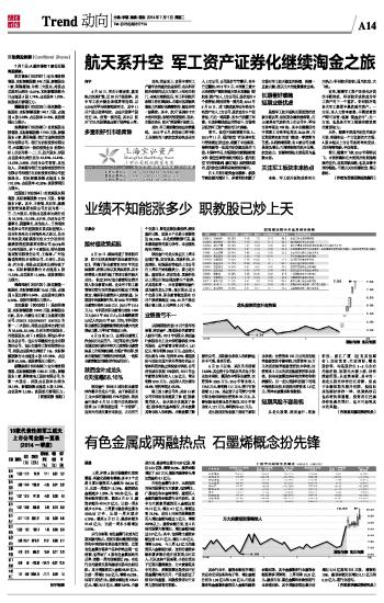 6月30日,两市小幅走高,盘面热点快速扩散,近50只个股涨停。其中军工航天概念表现异常抢眼,以3.93%的平均涨幅领涨两市,其中11只个股以涨停报收,占全天涨停个股的近1/4。值得一提的是,其中以“航天”打头的股票就占据了涨停板4席。 多重利好引市场青睐 首先,消息面上,首届中国军工产融年会传递的信息表明,有关科研院所改制的试点方案已上报有关部门,未来方案获批后,军工科研院所改制工作有望破冰。市场对这类极具想象力的题材充满着期待,概念炒作一触即发。其中,“航天”系拥有十大大型研究院,改制的预期强烈,因此,市场首先从“航天”类股票开始发力。 其次,军工重组赚钱效应持续蔓延。 2013年6月,航空动力将中航工业拥有的八家航空发动机企业注入上市公司,公司股价节节攀升,至今已近翻倍;2013年9月,中国重工重大无先例资产重组将超大型水面舰船(即航母)资产注入上市公司后,股价连拉4个涨停板;特别值得一提的是,2014年5月19日,成飞集成复牌公告将战斗机资产注入上市公司,股价连拉6个涨停板,而后一路高歌,至今已经翻了两番。在这种赚钱效应的带动下,市场难以抵挡军工资产重组的巨大诱惑。 第三,低空开放政策箭在弦上。2013年11月,《通用航空飞行任务审批与管理规定》的出台,刺激了中信海直、海特高新等一批通用航空概念股的飞涨。时隔半年后,市场期盼的重量级政策文件《低空空域管理使用规定》、《通用航空飞行管制条例(修订版)》或将很快颁布,通用航空业即将迎来发展的春天。 在6月底市场资金面缓解、新股节奏放缓的情况下,多重利好刺激了市场对军工航天概念的热情,热情一旦被点燃,便以巨大的能量爆发出来。 长期看好难掩 短期业绩忧虑 虽然军工航天板块长期投资价值被市场认同,但短期业绩依然难看。在10家具有代表性的上市公司中,平均市盈率高达768倍。其中业绩最好的中国重工市盈率也高达28.84倍,而近期涨势如虹的成飞集成一季度则为亏损。从利润增速看,有4家公司业绩呈现负增长;而增速较高的航天长峰、航空动力、抚顺特钢也主要是因为基数太低。 关注军工板块未来热点 未来,军工航天板块或将有三大热点:科研院所改制、通用航空、大飞机。 首先,随着军工资产证券化步伐的不断推进,科研院所或将成为军工资产的下一个富矿。科研院所是各大军工集团中最优质的资产。一方面,其人力资本密集,不需要重资产即可运营,堪称“现金奶牛”;另一方面,也是各大军工领域持续发展的重要动力。 另外,随着中国通用航空的逐步开放,将催生出一个万亿级的大市场,A股中相关上市公司或将率先受益,关注海特高新、中信海直。 第三,随着大飞机2015年即将试飞,中国将填补在大型民用机制造领域的空白,这是国家战略,也见证着中国的崛起。可重点关注洪都航空、博云新材。 (作者为西部证券投资顾问) 本版导读: