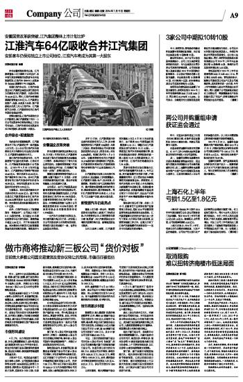 安徽国资改革获突破,江汽集团整体上市计划出炉 江淮汽车64亿吸收合并江汽集团安凯客车仍保持独立上市公司地位,江淮汽车将成为其第一大股东 2014-07-11 来源:证券时报网 作者:童璐