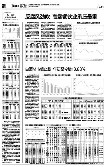 资金策市 Money Flow 国内声势浩大的反腐行动自2012年11月启动,为严惩腐败浪费及公款送礼消费等不正之风,中央自2012年出台了多项政策规定,对国内商品零售和餐饮业收入带来一定的影响。 在中国社会消费品零售总额指标组成部分中,餐饮服务和商品零售是两个最大的消费类型。数据显示,反腐以来两大消费类型均受到不同程度打击。 据统计,餐饮业在反腐败行动中受打击最大,中国餐饮业收入由2012年平均每月同比增长13.55%,降至2013年的9.07%,今年以来略微反弹增至10.65%。 由于公务消费在高端餐饮的消费群体中扮演着重要角色,使得限额以上企业(年主营业务收入200万元及以上的餐饮企业)餐饮收入总额跌幅更甚,该数据由2012年平均每月同比增长12.66%,降至2013年的-1.53%,虽然今年以来该指标平均增至5.23%,但是远远不如2012年的增长态势。 与餐饮业今年以来增长态势不同,国内商品零售业受政府大力反腐、经济增速放缓等因素的影响,经营状况不断恶化。据统计,国内商品零售总额由2012年平均每月同比增长14.29%降至2013年的13.75%,今年以来该指标继续下降至12.42%。限额以上企业(年营业收入500万元及以上的零售业企业)商品零售收入总额今年以来继续下降,由2012年平均每月同比增长14.69%,降至10.10%。(陈建如) 限额以上企业餐饮收入月度总额同比 各类资金当日净流量对比 据STCN资金流向快报(http://data.stcn.com/statisticalData.shtml)数据显示,7月10日,沪深两市共流出资金105.05亿元,连续第10个交易日净流出。其中,沪市净流出31.42亿元,深市净流出73.63亿元。主力资金合计流出31.50亿元。 指数方面,上证180指数成份股合计资金流出14.72亿元,深证成指成份股资金流出12.83亿元,沪深300指数成份股资金流出30.47亿元。以股本规模计,流通盘中大盘股资金流出23.88亿元,中盘股资金流出41.93亿元,小盘股资金流出39.23亿元。 行业方面,按照衍生申万一级行业分类计,有4个行业资金净流入,21个行业资金净流出。其中,有色金属流入资金1.87亿,成为资金最关注的行业;信息服务流出资金32.01 亿,有较明显的资金出逃现象。 黑色金属业已持续3个交易日净流入资金,共流入资金0.97亿,居行业连续流入天数榜首位。建筑建材业已持续10个交易日净流出资金,共流出资金17.08亿,为行业连续流出天数榜第一。 深纺织A已持续13个交易日净流入资金,累计流入资金1.57亿,居个股连续流入天数榜首位。郴电国际已持续18个交易日净流出资金,累计流出资金0.61亿,为个股连续流出天数榜第一。 股指期货方面,IF1407合约收报2133.20点,微跌0.22%;成交37.98万手,持仓量减2289手,收报10.50万手。(黄舒欣) 白酒总市值止跌 年初至今增13.88% 2012年以来随着限制“三公消费”、禁酒令等一系列反腐措施及塑化剂事件使得白酒行业以往的超高增长态势不复存在,白酒业从此告别黄金年代,拉开洗牌的序幕。 贵州茅台一直是“官酒”及“土豪”的代名词,伴随着盛名,股价也曾一路走高,在2012年7月16日,股价高达266.08元。然而,在限制“三公消费”的一声令下,整个行业集体入冬,贵州茅台也未能幸免,去年最低价跌至122.50元,市值也从2013年初的2148.41亿元,跌至2014年初的1307.90亿元,缩水39.12%。 去年整个白酒板块A股市值大幅缩水,据统计,14家上市白酒企业2013年初的总市值为5727.32亿元,到2014年初,总市值降至3164.10亿元。一年时间,这14家白酒企业市值蒸发2563.22亿元,缩水44.75%。 除了市值大幅缩水外,上市酒企今年中期业绩预告也不理想。目前,14家上市酒企有4家公布了2014年中期业绩,3家预降,预降幅度在30%以内,1家预亏。 虽然上市酒企2014年中期业绩预告不理想,但是,今年以来,资金层面对白酒行业的信心有所恢复,市值有所提升。统计显示,14家上市酒企A股总市值由今年初的3164.10亿元,增至目前的3603.41亿元,增幅13.88%。(陈建如) 上市酒企2012年12月以来总市值变化走势图 (专题数据由证券时报中心数据库提供,数据来源于上市公司公告,若有出入,请以公告为准) 贵州茅台2012年至今总市值变化走势图 商品零售业零售总额月度同比 前20名会员持买单量和卖单量合计 中金所结算会员成交持仓排名 (合约IF1407,数据截至2014.7.10) (注:数据基于模型测算,不构成投资建议,仅供投资者参考。更多详情:http://idea.stcn.com) 本版导读: