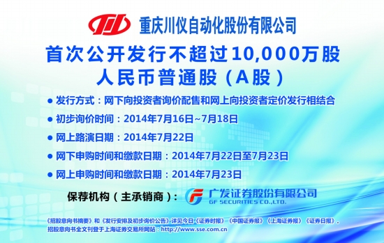 [报眼]重庆川仪自动化股份有限公司 首次公开发行不超过10,000万股人民币普通股(A股)
