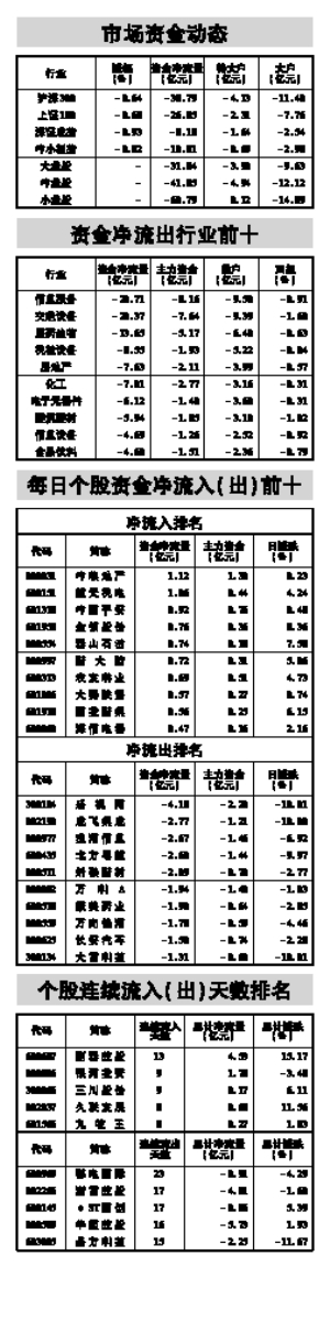 据STCN资金流向快报(http://data.stcn.com/statisticalData.shtml)数据显示,7月17日,沪深两市共流出资金134.49亿元,连续第15个交易日净流出。其中,沪市净流出59.31亿元,深市净流出75.17亿元。主力资金合计流出45.35亿元。 指数方面,上证180指数成份股资金流出26.85亿元,深证成指成份股资金流出8.18亿元,沪深300指数成份股资金流出38.79亿元。以股本规模计,流通盘中大盘股资金流出31.84亿元,中盘股资金流出41.85亿元,小盘股资金流出60.79亿元。 行业方面,按照衍生申万一级行业分类计,有1个行业资金净流入,24个行业资金净流出。其中,保险流入资金0.76亿,成为资金最关注的行业;信息服务流出资金20.71亿,有较明显的资金出逃现象。 保险业已持续2个交易日净流入资金,共流入资金0.76亿,居行业连续流入天数榜首位。银行业已持续11个交易日净流出资金,共流出资金33.43亿,为行业连续流出天数榜第一。 刚泰控股已持续13个交易日净流入资金,累计流入资金4.53亿,居个股连续流入天数榜首位。郴电国际已持续23个交易日净流出资金,累计流出资金0.91亿,为个股连续流出天数榜第一。 股指期货方面,IF1407合约收报2155.80点,微跌0.38%;成交26.44万手,持仓量减27650手,收报2.89万手;资金共流出30.23亿。(陈见南) 本版导读:
