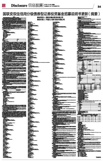 十五、基金费用与税收 (一)基金费用的种类 1、基金管理人的管理费; 2、基金托管人的托管费; 3、基金销售服务费; 4、因基金的证券交易或结算而产生的费用; 5、基金合同生效以后的信息披露费用; 6、基金份额持有人大会费用; 7、基金合同生效以后的会计师费和律师费; 8、基金资产的资金汇划费用; 9、按照国家有关法律法规规定可以列入的其他费用。 (二)基金费用计提方法、计提标准和支付方式 1、基金管理人的管理费 基金管理人的基金管理费按基金资产净值的0.70%年费率计提。 在通常情况下,基金管理费按前一日基金资产净值的0.70%年费率计提。计算方法如下: H=E×0.70%÷当年天数 H 为每日应计提的基金管理费 E 为前一日基金资产净值 基金管理费每日计提,按月支付。经基金管理人与基金托管人核对一致后,由基金托管人于次月首日起3个工作日内从基金资产中一次性支付给基金管理人。 2、基金托管人的基金托管费 基金托管人的基金托管费按基金资产净值的0.20%年费率计提。 在通常情况下,基金托管费按前一日基金资产净值的0.20%年费率计提。计算方法如下: H=E×0.20%÷当年天数 H 为每日应计提的基金托管费 E 为前一日的基金资产净值 基金托管费每日计提,按月支付。经基金管理人与基金托管人核对一致后,由基金托管人于次月首日起3个工作日内从基金资产中一次性支付给基金托管人。 3、基金销售服务费 基金销售服务费用于支付销售机构佣金、基金的营销费用以及基金份额持有人服务费等。本基金销售服务费仅在基金合同生效起至三年届满日收取,三年届满日后,本基金不收取销售服务费。 本基金的基金销售服务费按前一日基金资产净值的0.35%年费率计提。基金销售服务费费的计算方法如下: H=E×0.35%÷当年天数 H为每日应计提的基金销售服务费 E为前一日的基金资产净值 基金销售服务费每日计算,逐日累计至每月月末,按月支付,由基金管理人向基金托管人发送基金销售服务费划款指令,基金托管人复核后于次月前2个工作日内从基金财产中划出,由基金管理人按相关合同规定支付给基金销售机构。若遇法定节假日、公休假等,支付日期顺延。 4、本条第(一)款第4至第9项费用由基金管理人和基金托管人根据有关法规及相应协议的规定,列入当期基金费用。 5、基金管理人应当在基金半年度报告和基金年度报告中披露从基金财产中计提的管理费、托管费的金额,并说明管理费中支付给基金销售机构的客户维护费总额。 (三)不列入基金费用的项目 本条第(一)款约定以外的其他费用,以及基金管理人和基金托管人因未履行或未完全履行义务导致的费用支出或基金财产的损失不列入基金费用。 (四)基金管理费和基金托管费的调整 基金管理人和基金托管人可协商酌情调低基金管理费和基金托管费,无须召开基金份额持有人大会,基金管理人应于新的费率实施日3个工作日前在指定媒体公告。 (五)税收 本基金运作过程中涉及的各纳税主体,依照国家法律法规的规定履行纳税义务。 十六、对招募说明书更新部分的说明 本招募说明书依据《中华人民共和国证券投资基金法》、《证券投资基金运作管理办法》、《证券投资基金销售管理办法》、《证券投资基金信息披露管理办法》及其他有关法律法规的要求,对本基金管理人于2014年1月17日刊登的本基金原招募说明书进行了更新,主要更新的内容如下: 1、更新了“三、基金管理人” 部分的内容。 2、更新了“四、基金托管人” 部分的内容。 3、更新了“五、相关服务机构” 部分的内容。 4、更新了“七、基金份额的分级” 部分的内容。 5、更新了“九、双佳A的份额折算” 部分的内容。 6、更新了“十三、基金的投资” 部分的内容。 7、更新了“十四、基金的业绩”部分的内容。 8、更新了“二十七、其他应披露事项”部分的内容。 国联安基金管理有限公司 二〇一四年七月十八日 本版导读: