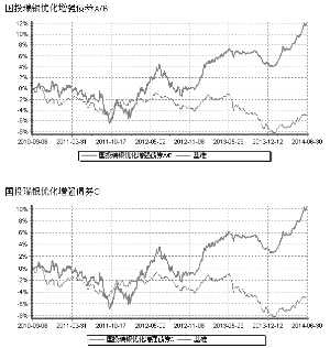 基金管理人:国投瑞银基金管理有限公司 基金托管人:中国建设银行股份有限公司 报告送出日期:2014年7月18日 §1 重要提示 ■ §2 基金产品概况 ■ §3 主要财务指标和基金净值表现 3.1 主要财务指标 单位:人民币元 ■ 注:1、本期已实现收益指基金本期利息收入、投资收益、其他收入(不含公允价值变动收益)扣除相关费用后的余额,本期利润为本期已实现收益加上本期公允价值变动收益。 2、以上所述基金业绩指标不包括持有人认购或交易基金的各项费用(例如基金申购赎回费、基金转换费等),计入费用后实际收益水平要低于所列数字。 3.2 基金净值表现 3.2.1 本报告期基金份额净值增长率及其与同期业绩比较基准收益率的比较 国投瑞银优化增强债券A/B ■ 国投瑞银优化增强债券C ■ 注:1、本基金以中债总指数收益率×90%+沪深300 指数收益率×10%作为业绩比较基准。中债总指数是由中央国债登记结算有限责任公司编制的中国债券指数。该指数同时覆盖了上海证券交易所、银行间以及银行柜台债券市场上的主要固定收益类证券,具有广泛的市场代表性,能够反映债券市场总体走势,适合作为本基金的债券投资业绩比较基准。沪深300指数是由中证指数公司开发的中国A股市场统一指数,它的样本选自沪深两个证券市场,覆盖了大部分流通市值,其成份股票为中国A股市场中代表性强、流动性高的主流投资股票, 能够反映A股市场总体发展趋势,具有权威性,适合作为本基金股票投资业绩比较基准。 2、本基金对业绩比较基准采用每日再平衡的计算方法。 3.2.2 自基金合同生效以来基金累计净值增长率变动及其与同期业绩比较基准收益率变动的比较 ■ ■ 注:本基金建仓期为自基金合同生效日起的3个月。截至建仓期结束,本基金各项资产配置比例符合基金合同及招募说明书有关投资比例的约定。 §4 管理人报告 4.1 基金经理(或基金经理小组)简介 ■ 注:任职日期和离任日期均指公司作出决定后正式对外公告之日。证券从业的含义遵从行业协会《证券业从业人员资格管理办法》的相关规定。 4.2 管理人对报告期内本基金运作遵规守信情况的说明 在报告期内,本基金管理人遵守《证券投资基金法》及其系列法规和《国投瑞银优化增强债券型证券投资基金基金合同》等有关规定,本着恪守诚信、审慎勤勉,忠实尽职的原则,为基金份额持有人的利益管理和运用基金资产。在报告期内,基金的投资决策规范,基金运作合法合规,没有损害基金份额持有人利益的行为。 4.3 公平交易专项说明 4.3.1 公平交易制度的执行情况 报告期内,本基金管理人严格执行了公平交易相关的系列制度,通过工作制度、流程和技术手段保证公平交易原则的实现,以确保本基金管理人旗下各投资组合在研究、决策、交易执行等各方面均得到公平对待,通过对投资交易行为的监控、分析评估和信息披露来加强对公平交易过程和结果的监督,形成了有效的公平交易体系。本报告期,本基金管理人各项公平交易制度流程均得到良好地贯彻执行,未发现存在违反公平交易原则的现象。 4.3.2 异常交易行为的专项说明 本基金于本报告期内不存在异常交易行为。 基金管理人管理的所有投资组合在本报告期内未出现参与交易所公开竞价同日反向交易成交较少的单边交易量超过该证券当日总成交量5%的情况。 4.4 报告期内基金的投资策略和运作分析 2014年2季度,中国的宏观经济政策继续微调,政府稳增长措施继续出台,货币政策小幅放松,中国经济增速出现企稳迹象。其中,5月工业生产同比增速为8.8%,增速与1季度末持平,1-5月固定资产投资增速为17.2%,比1季度增速下滑0.4个百分点。5月份社会消费品零售总额增速12.5%,比1季度末增速有所加快,而5月份出口同比增长7%,出口增长有所恢复。5月份CPI同比增长2.5%,PPI同比负增长1.4%,通胀保持在低位。从资金面来看,2季度资金面维持宽松,银行间7天回购利率基本在3.5%附近波动,而6月中旬以后IPO重启迭加半年末季节性的资金紧张则对资金面有所冲击,但总体冲击幅度可控,好于去年同期。 受以上因素的综合影响,2季度债券市场各品种收益率继续下行,短端利率下行幅度更大一些,收益率曲线进一步陡峭化,低评级债券表现优于高评级债券。本期本基金对债券组合持仓结构有所调整,增加了对信用债和可转债的配置,降低了对利率债的配置比例,并适当增加了对权益类资产的配置。 4.5 报告期内基金的业绩表现 截至报告期末,国投瑞银优化增强债券A/B级份额净值为1.079元,国投瑞银优化增强债券C级份额净值为1.083元,本报告期国投瑞银优化增强债券A/B级份额净值增长率4.66%,国投瑞银优化增强债券C级份额净值增长率4.54%,同期业绩比较基准收益率为2.45%。基金份额净值增长率高于业绩比较基准,主要因为高配债券尤其是信用债,低配股票资产。 4.6 管理人对宏观经济、证券市场及行业走势的简要展望 展望未来,随着政府稳增长的政策逐步发挥作用,我们预计3季度中国经济低位企稳的可能性较大,债券市场或有一定压力。但由于经济结构性的问题未得到有效解决,宏观经济即使重回增长其高度也较为有限,而央行的货币政策仍将保持中性略松,债券市场收益率大幅上行的可能性也不大。本基金队对债券组合将以持有为主,如有较大调整将继续增加对信用产品的配置。对于股票市场,本基金