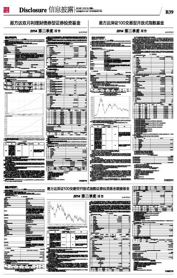 基金管理人:易方达基金管理有限公司 基金托管人:中国建设银行股份有限公司 报告送出日期:二〇一四年七月二十一日 §1 重要提示 基金管理人的董事会及董事保证本报告所载资料不存在虚假记载、误导性陈述或重大遗漏,并对其内容的真实性、准确性和完整性承担个别及连带责任。 基金托管人中国建设银行股份有限公司根据本基金合同规定,于2014年7月16日复核了本报告中的财务指标、净值表现和投资组合报告等内容,保证复核内容不存在虚假记载、误导性陈述或者重大遗漏。 基金管理人承诺以诚实信用、勤勉尽责的原则管理和运用基金资产,但不保证基金一定盈利。 基金的过往业绩并不代表其未来表现。投资有风险,投资者在作出投资决策前应仔细阅读本基金的招募说明书。 本报告中财务资料未经审计。 本报告期自2014年4月1日起至6月30日止。 §2 基金产品概况 ■ §3 主要财务指标和基金净值表现 3.1 主要财务指标 单位:人民币元 ■ 注:1.本期已实现收益指基金本期利息收入、投资收益、其他收入(不含公允价值变动收益)扣除相关费用后的余额,本期利润为本期已实现收益加上本期公允价值变动收益,由于本基金采用摊余成本法核算,因此,公允价值变动收益为零,本期已实现收益和本期利润的金额相等。 2.本基金利润分配是按运作期结转份额。 3.2 基金净值表现 3.2.1 本报告期基金份额净值收益率及其与同期业绩比较基准收益率的比较 易方达双月利理财债券A ■ 易方达双月利理财债券B ■ 3.2.2自基金合同生效以来基金累计净值收益率变动及其与同期业绩比较基准收益率变动的比较 易方达双月利理财债券型证券投资基金 累计净值收益率与业绩比较基准收益率的历史走势对比图 (2013年1月15日至2014年6月30日) 易方达双月利理财债券A ■ 易方达双月利理财债券B ■ 注:1.按基金合同和招募说明书的约定,本基金的建仓期为两个月,建仓期结束时各项资产配置比例符合基金合同(第十二部分(二)投资范围、(三)投资策略和(六)投资限制)的有关约定。 2.自基金合同生效至报告期末,A类基金份额净值收益率为6.8916%,B类基金份额净值收益率为7.3419%,同期业绩比较基准收益率为1.9950%。 §4 管理人报告 4.1 基金经理(或基金经理小组)简介 ■ 注:1.此处的“任职日期”为基金合同生效之日,“离任日期”为公告确定的解聘日期。 2.证券从业的含义遵从行业协会《证券业从业人员资格管理办法》的相关规定。 4.2管理人对报告期内本基金运作遵规守信情况的说明 本报告期内,本基金管理人严格遵守《证券投资基金法》等有关法律法规及基金合同、基金招募说明书等有关基金法律文件的规定,以取信于市场、取信于社会投资公众为宗旨,本着诚实信用、勤勉尽责的原则管理和运用基金资产,在控制风险的前提下,为基金份额持有人谋求最大利益。在本报告期内,基金运作合法合规,无损害基金份额持有人利益的行为。 4.3 公平交易专项说明 4.3.1 公平交易制度的执行情况 本基金管理人主要通过建立有纪律、规范化的投资研究和决策流程、交易流程,以及强化事后监控分析来确保公平对待不同投资组合,切实防范利益输送。本基金管理人规定了严格的投资权限管理制度、投资备选库管理制度和集中交易制度等,并重视交易执行环节的公平交易措施,以“时间优先、价格优先”作为执行指令的基本原则,通过投资交易系统中的公平交易模块,以尽可能确保公平对待各投资组合。本报告期内,公平交易制度总体执行情况良好。 4.3.2 异常交易行为的专项说明 本报告期内,公司旗下所有投资组合参与的交易所公开竞价交易中,同日反向交易成交较少的单边交易量超过该证券当日成交量的5%的交易共有4次,为纯被动指数基金因投资策略需要和其他组合发生的反向交易。 本报告期内,未发现本基金有可能导致不公平交易和利益输送的异常交易。 4.4 报告期内基金的投资策略和业绩表现说明 4.4.1报告期内基金投资策略和运作分析 2014年二季度国内经济有所企稳,但是总体仍然处于较弱的状态,5月工业增加值同比增长8.8%,月度环比由1%升至9.6%。5月消费同比增长12.5%,月度环比由11.8%升至18.9%,同样有所企稳。投资增速水平仍较低,从结构上看,房地产投资和制造业投资增速大幅下滑,而基建投资增速大幅上升,这可能意味着经济主体自主的投资意愿明显下滑。5月季调后的出口数据有所增长,但是幅度非常微弱,并不足以拉动济增长。通胀水平有所上升,但总体水平稳定,变动不大。由于表外融资的下降,社会融资总量的环比增速比表内贷款增速更为平稳,没有出现明显回升。海外方面,一季度受到严寒天气和企业补充库存的影响而表现不佳的美国经济,在二季度恢复增长;欧洲经济在二季度则再现弱势。 经济基本面较弱的态势为二季度的债券市场提供了支撑,市场机构在二季度配置债券的热情仍然较高。二季度的货币政策较为宽松,公开市场操作在五、六月维持了净投放;除此之外,央行在四、五月两度实施了定向下调准备金率的政策。除了六月IPO重启导致市场资金面出现了短期的紧张和六月底资金利率季节性上行之外,整个二季度,银行间市场资金面延续了一季度宽松的态势。债券市场在二季度延续了一季度的牛市,市场收益率继续下行,1年期政策性金融债和AAA级短融的收益率在二季度下