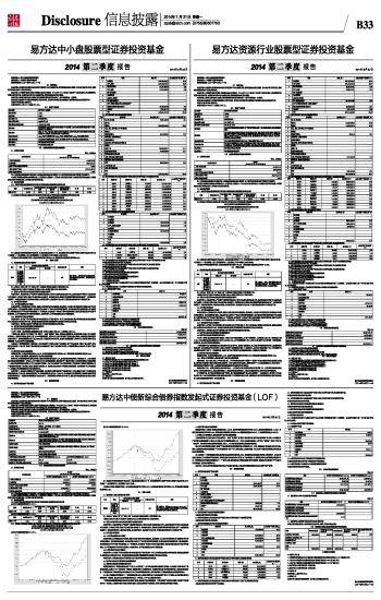 基金管理人:易方达基金管理有限公司 基金托管人:中国农业银行股份有限公司 报告送出日期:二〇一四年七月二十一日 §1 重要提示 基金管理人的董事会及董事保证本报告所载资料不存在虚假记载、误导性陈述或重大遗漏,并对其内容的真实性、准确性和完整性承担个别及连带责任。 基金托管人中国农业银行股份有限公司根据本基金合同规定,于2014年7月16日复核了本报告中的财务指标、净值表现和投资组合报告等内容,保证复核内容不存在虚假记载、误导性陈述或者重大遗漏。 基金管理人承诺以诚实信用、勤勉尽责的原则管理和运用基金资产,但不保证基金一定盈利。 基金的过往业绩并不代表其未来表现。投资有风险,投资者在作出投资决策前应仔细阅读本基金的招募说明书。 本报告中财务资料未经审计。 本报告期自2014年4月1日起至6月30日止。 §2 基金产品概况 ■ §3 主要财务指标和基金净值表现 3.1 主要财务指标 单位:人民币元 ■ 注:1.所述基金业绩指标不包括持有人认购或交易基金的各项费用,计入费用后实际收益水平要低于所列数字。 2.本期已实现收益指基金本期利息收入、投资收益、其他收入(不含公允价值变动收益)扣除相关费用后的余额,本期利润为本期已实现收益加上本期公允价值变动收益。 3.2 基金净值表现 3.2.1本报告期基金份额净值增长率及其与同期业绩比较基准收益率的比较 易方达中债新综指发起式(LOF)A ■ 易方达中债新综指发起式(LOF)C ■ 3.2.2 自基金合同生效以来基金累计净值增长率变动及其与同期业绩比较基准收益率变动的比较 易方达中债新综合债券指数发起式证券投资基金(LOF) 累计净值增长率与业绩比较基准收益率的历史走势对比图 (2012年11月8日至2014年6月30日) 易方达中债新综指发起式(LOF)A ■ 易方达中债新综指发起式(LOF)C ■ 注:1.按基金合同和招募说明书的约定,本基金的建仓期为六个月,建仓期结束时各项资产配置比例符合基金合同(第十三部分二、投资范围和五、投资限制)的有关约定。 2.自基金合同生效至报告期末,A类基金份额净值增长率为1.97%,C类基金份额净值增长率为1.73%,同期业绩比较基准收益率为6.04%。 §4 管理人报告 4.1 基金经理(或基金经理小组)简介 ■ 注:1.此处的“任职日期”和“离任日期”分别为公告确定的聘任日期和解聘日期。 2.证券从业的含义遵从行业协会《证券业从业人员资格管理办法》的相关规定。 4.2 管理人对报告期内本基金运作遵规守信情况的说明 本报告期内,本基金管理人严格遵守《证券投资基金法》等有关法律法规及基金合同、基金招募说明书等有关基金法律文件的规定,以取信于市场、取信于社会投资公众为宗旨,本着诚实信用、勤勉尽责的原则管理和运用基金资产,在控制风险的前提下,为基金份额持有人谋求最大利益。在本报告期内,基金运作合法合规,无损害基金份额持有人利益的行为。 4.3 公平交易专项说明 4.3.1 公平交易制度的执行情况 本基金管理人主要通过建立有纪律、规范化的投资研究和决策流程、交易流程,以及强化事后监控分析来确保公平对待不同投资组合,切实防范利益输送。本基金管理人规定了严格的投资权限管理制度、投资备选库管理制度和集中交易制度等,并重视交易执行环节的公平交易措施,以“时间优先、价格优先”作为执行指令的基本原则,通过投资交易系统中的公平交易模块,以尽可能确保公平对待各投资组合。本报告期内,公平交易制度总体执行情况良好。 4.3.2 异常交易行为的专项说明 本报告期内,公司旗下所有投资组合参与的交易所公开竞价交易中,同日反向交易成交较少的单边交易量超过该证券当日成交量的5%的交易共有4次,为纯被动指数基金因投资策略需要和其他组合发生的反向交易。 本报告期内,未发现本基金有可能导致不公平交易和利益输送的异常交易。 4.4 报告期内基金的投资策略和业绩表现说明 4.4.1报告期内基金投资策略和运作分析 我国宏观经济在二季度依然显示出下行压力。在此背景下,央行释放流动性的意愿明显增加,在大部分时间内保持了资金面的宽松。虽然6月中下旬资金面一度紧张,但回购利率上升幅度有限,对债券市场也没有带来明显冲击。除资金面的稳定外,二季度政府对于降低融资成本的表态以及央行定向降准政策的出台也带动市场对于货币政策放松的预期逐渐增加。 在上述几项因素的共同影响下,二季度债券市场的买入需求持续释放,收益率呈现平坦化下行趋势。信用市场收益率与利率市场一同回落,但总体而言信用利差并没有进一步压缩,5月中旬以来还略有回升。 二季度基金继续按照指数的结构和久期进行配置。但是由于基金规模较小,个别大类资产的权重与指数中该资产的权重仍存在一定偏差。目前组合整体有效久期接近指数;而经过类属资产的调整后,组合的费前收益率略高于指数。 4.4.2报告期内基金的业绩表现 截至报告期末,本基金A类基金份额净值为1.0197元,本报告期份额净值增长率为1.96%;C类基金份额净值为1.0173元,本报告期份额净值增长率为1.86%;同期业绩比较基准收益率为3.27%。跟踪误差控制在2%以内,日均偏离度控制在0.2%以内。 4.4.3管理人对宏观经济、证券市场及行业走势的简要展望 目前市场判断的主要分歧在于经过前期的一系列“微刺激”政策后,经济基本面