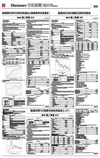 基金管理人:融通基金管理有限公司 基金托管人:中国工商银行股份有限公司 报告送出日期:2014年7月21日 §1 重要提示 融通通利系列证券投资基金由融通债券投资基金、融通深证100指数证券投资基金和融通蓝筹成长证券投资基金共同构成。本报告为融通通利系列证券投资基金之子基金融通债券投资基金(以下简称“本基金”)2014年第2季度报告。 基金管理人的董事会及董事保证本报告中所载资料不存在虚假记载、误导性陈述或重大遗漏,并对其内容的真实性、准确性和完整性承担个别及连带责任。 基金托管人中国工商银行股份有限公司根据《融通通利系列证券投资基金基金合同》规定,于2014年7月15日复核了本报告中的财务指标、净值表现和投资组合报告等内容,保证复核内容不存在虚假记载、误导性陈述或者重大遗漏。 基金管理人承诺以诚实信用、勤勉尽责的原则管理和运用基金资产,但不保证基金一定盈利。 基金的过往业绩并不代表其未来表现。投资有风险,投资者在作出投资决策前应仔细阅读本基金的招募说明书。 本报告中财务资料未经审计。 本报告期自2014年4月1日起至2014年6月30日止。 §2 基金产品概况 ■ §3 主要财务指标和基金净值表现 3.1 主要财务指标 单位:人民币元 ■ 注:1、本期已实现收益指基金本期利息收入、投资收益、其他收入(不含公允价值变动收益)扣除相关费用后的余额,本期利润为本期已实现收益加上本期公允价值变动收益; 2、本报告所列示的基金业绩指标不包括持有人认购或交易基金的各项费用,计入费用后实际收益水平要低于所列数字。 3.2 基金净值表现 3.2.1 本报告期基金份额净值增长率及其与同期业绩比较基准收益率的比较 1、融通债券A/B类 ■ 2、融通债券C类 ■ 3.2.2 自基金合同生效以来基金累计净值增长率变动及其与同期业绩比较基准收益率变动的比较 1、融通债券A/B类 ■ 注:本基金A类基金份额业绩比较基准项目分段计算,其中:2009年12月31日(含此日)之前采用“银行间债券综合指数”,2010年1月1日起使用新基准即“中信标普全债指数收益率”。 2、融通债券C类 ■ §4 管理人报告 4.1 基金经理(或基金经理小组)简介 ■ 注:任职日期根据基金管理人对外披露的任免日期填写;证券从业年限以从事证券业务相关工作的时间为计算标准。 4.2 管理人对报告期内本基金运作遵规守信情况的说明 本报告期内,本基金管理人严格遵守《证券投资基金法》及其他有关法律法规、《融通通利系列证券投资基金基金合同》的规定,本着诚实信用、勤勉尽责的原则管理和运用基金资产,在严格控制风险的基础上,为基金持有人谋求最大利益,无损害基金持有人利益的行为。基金投资组合符合有关法律、法规的规定及基金合同的约定。 4.3 公平交易专项说明 4.3.1 公平交易制度的执行情况 本基金管理人一直坚持公平对待旗下所有投资组合的原则,并制定了相应的制度和流程,在授权、研究、决策、交易和业绩评估等各个环节保证公平交易制度的严格执行。报告期内,本基金管理人严格执行了公平交易的原则和制度。 4.3.2 异常交易行为的专项说明 本基金报告期内未发生异常交易。 4.4 报告期内基金投资策略和运作分析 2014年2季度,资金面依然较为宽松,央行在此期间进行了两次定向降准,在5、6月份通过公开市场进行了资金投放,整个2季度的资金面大幅宽松,银行间质押式回购利率中枢始终维持在低位水平,且资金面非常平稳,回购利率波动幅度很小,从而推动了债券市场收益率大幅度下行。 投资方面,本基金在2季度继续加强了对高资质债券品种的配置,降低了低评级债券的仓位。 在出口需求改善和政府稳增长措施的共同作用下,经济在5、6月份有改善迹象,中采PMI数据连续4个月出现改善。但从经济结构上看,房地产投资尚未出现企稳的痕迹;工业品的价格也未见明显回升,复苏能否持续仍存在不确定性。 资金面方面,银行间回购利率中枢已经低于去年“钱荒”之前的正常水平,且波动较以往更加平稳,预计在三季度,资金面仍将保持宽松平稳,信用债绝对收益率仍在高位,具备较高投资价值 本基金3季度将保持目前杠杆水平,继续配置流动性好资质高的债券,提高信用债占比。 4.5 报告期内基金的业绩表现 本报告期内,融通债券A/B类份额净值增长率为4.15%,融通债券C类份额净值增长率为4.15%,同期业绩比较基准收益率为2.41%。 §5 投资组合报告 5.1 报告期末基金资产组合情况 ■ 5.2 报告期末按债券品种分类的债券投资组合 ■ 5.3 报告期末按公允价值占基金资产净值比例大小排序的前五名债券投资明细 ■ 5.4 报告期末按公允价值占基金资产净值比例大小排序的前十名资产支持证券投资明细 本基金本报告期末未持有资产支持证券。 5.5 报告期末按公允价值占基金资产净值比例大小排序的前五名贵金属投资明细 本基金本报告期末未持有贵金属。 5.6 报告期末按公允价值占基金资产净值比例大小排序的前五名权证投资明细 本基金不进行主动权证投资,本报告期末未持有因投资可分离转债而获配的权证。 5.7 报告期末本基金投资的国债期货交易情况说明 5.7.1 本期国债期货投资政策 本基金本报告期未投资国债期货。 5.7.2 报告期末本基金投资的国债期货持仓和损益明细 本基金本报告期末未持有国债期货。 5.7.3 本期国债期货投资评价 