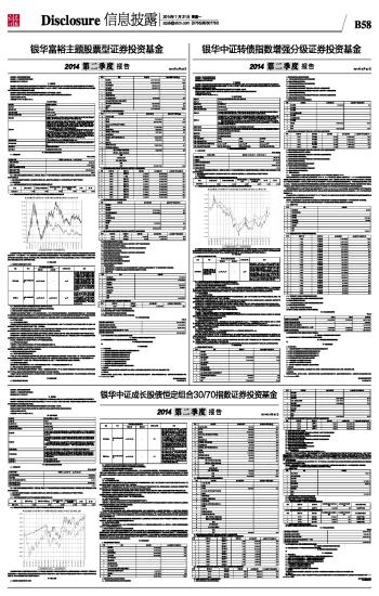 基金管理人:银华基金管理有限公司 基金托管人:中国银行股份有限公司 报告送出日期:2014年7月21日 §1 重要提示 基金管理人的董事会及董事保证本报告所载资料不存在虚假记载、误导性陈述或重大遗漏,并对其内容的真实性、准确性和完整性承担个别及连带责任。 基金托管人中国银行股份有限公司根据本基金合同规定,于2014年7月17日复核了本报告中的财务指标、净值表现和投资组合报告等内容,保证复核内容不存在虚假记载、误导性陈述或者重大遗漏。 基金管理人承诺以诚实信用、勤勉尽责的原则管理和运用基金资产,但不保证基金一定盈利。 基金的过往业绩并不代表其未来表现。投资有风险,投资者在作出投资决策前应仔细阅读本基金的招募说明书。 本报告中财务资料未经审计。 本报告期自2014年4月1日起至6月30日止。 §2 基金产品概况 ■ §3 主要财务指标和基金净值表现 3.1 主要财务指标 单位:人民币元 ■ 注:1、本期已实现收益指基金本期利息收入、投资收益、其他收入(不含公允价值变动收益)扣除相关费用后的余额,本期利润为本期已实现收益加上本期公允价值变动收益。 2、上述本基金业绩指标不包括持有人交易基金的各项费用,例如:基金的申购、赎回费等,计入费用后实际收益水平要低于所列数字。 3.2 基金净值表现 3.2.1 本报告期基金份额净值增长率及其与同期业绩比较基准收益率的比较 ■ 3.2.2 自基金合同生效以来基金份额累计净值增长率变动及其与同期业绩比较基准收益率变动的比较 ■ 注:本基金基金合同生效日期为2013年8月15日,自基金合同生效日起到本报告期末不满一年,按基金合同的规定,本基金自基金合同生效起六个月为建仓期,建仓期结束时本基金的各项资产配置比例已达到基金合同的规定:投资于固定收益类证券的比例不低于基金资产的80%,其中投资于中证转债指数的成份券及其备选成份券的比例不低于基金非现金资产的80%;本基金持有现金或到期日在一年以内的政府债券不低于基金资产净值的5%。 §4 管理人报告 4.1 基金经理(或基金经理小组)简介 ■ 注:1、此处的任职日期和离任日期均指基金合同生效日或公司作出决定之日。 2、证券从业的含义遵从行业协会《证券业从业人员资格管理办法》的相关规定。 4.2 管理人对报告期内本基金运作遵规守信情况的说明 本基金管理人在本报告期内严格遵守《中华人民共和国证券法》、《中华人民共和国证券投资基金法》、《证券投资基金运作管理办法》及其各项实施准则、《银华中证转债指数增强分级证券投资基金》和其他有关法律法规的规定,本着诚实信用、勤勉尽责的原则管理和运用基金资产,在严格控制风险的基础上,为基金份额持有人谋求最大利益,无损害基金份额持有人利益的行为。本基金无违法、违规行为。本基金投资组合符合有关法规及基金合同的约定。 4.3 公平交易专项说明 4.3.1 公平交易制度的执行情况 本基金管理人根据中国证监会颁布的《证券投资基金管理公司公平交易制度指导意见》,制定了《公平交易制度》和《公平交易执行制度》等,并建立了健全有效的公平交易执行体系,保证公平对待旗下的每一个投资组合。 在投资决策环节,本基金管理人构建了统一的研究平台,为旗下所有投资组合公平地提供研究支持。同时,在投资决策过程中,各基金经理、投资经理严格遵守本基金管理人的各项投资管理制度和投资授权制度,保证各投资组合的独立投资决策机制。 在交易执行环节,本基金管理人实行集中交易制度,按照“时间优先、价格优先、比例分配、综合平衡”的原则,确保各投资组合享有公平的交易执行机会。 在事后监控环节,本基金管理人定期对股票交易情况进行分析,并出具公平交易执行情况分析报告;另外,本基金管理人还对公平交易制度的遵守和相关业务流程的执行情况进行定期和不定期的检查,并对发现的问题进行及时报告。 综上所述,本基金管理人在本报告期内严格执行了公平交易制度的相关规定。 4.3.2 异常交易行为的专项说明 本报告期内,本基金未发现存在可能导致不公平交易和利益输送的异常交易行为。 本报告期内,本基金管理人所有投资组合参与的交易所公开竞价同日反向交易成交较少的单边交易量超过该证券当日成交量的5%的情况有4次,原因是指数型投资组合投资策略需要,未导致不公平交易和利益输送。 4.4 报告期内基金的投资策略和业绩表现的说明 4.4.1 报告期内基金投资策略和运作分析 二季度随着宏观经济的企稳以及“微刺激”政策的持续出台,股市止跌,但波动率大幅下降,进入一个窄幅震荡区间,沪深300指数累计上涨0.88%。与此同时,随着债券收益率的下降,转债债底抬升;再叠加流动性的宽松,转债估值有所扩张,整体表现优于股票,中证转债指数累计上涨5.36%。 在报告期内,本基金综合考虑了样本券属性、流动性以及配置价值等多方面因素,采用了优化分层复制策略,保持了对指数的跟踪;同时,根据市场变化,适当做了一些波段操作,起到了增强收益的作用。 4.4.2 报告期内基金的业绩表现 截至报告期末,本基金份额净值为0.971元,本报告期份额净值增长率为6.24%,同期业绩比较基准收益率为5.09%。 4.5 管理人对宏观经济、证券市场及行业走势的简要展望 展望三季度,市场仍在“宏观经济下行风险”和“政