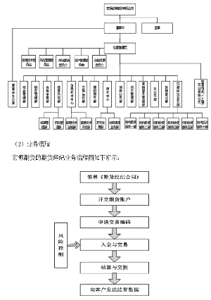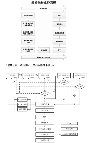 (3)报告期内经营情况 宏源期货经过六年多的发展,初步形成了管理、研究咨询、客户服务和市场营销队伍,按照现代企业制度的要求建立了规范的制度体系和管理架构,搭建了快捷的交易和信息资讯平台,初步形成了一定的市场开发能力、客户服务能力和风险控制能力,业务规模快速成长,多次荣获交易所、行业协会和相关媒体的荣誉和奖励。宏源期货的日均客户保证金从2008年初的不足1亿元增至近17亿元,增长了近19倍,年均增幅80%;年营业收入从两千多万元增至近2亿元,增长了10倍,年均增幅52%;年度利润从不足百万元增至7,374万元,增长近148倍。 2010年,在股指期货推出上市后,宏源期货把握商品期货和金融期货市场规模和品种快速发展的机遇,加大业务开拓力度,加强新品种的客户推广,期货交易量市场份额、收入及在业务总收入中的占比均稳步提升。 2011年,宏源证券期货业务实现收入 9,883.21万元,占同期业务总收入的4.20%。2012年,宏源证券期货业务实现收入 16,078.20万元,占同期业务总收入的4.88%。2013年,宏源证券期货业务实现收入 20,356.72万元,占同期业务总收入的4.94%。 报告期内,宏源期货的经营规模情况如下表所示: ■ 宏源期货曾荣获金融界、中国证券报、CCTV证券资讯频道、证券之星评选的最具成长性期货公司(2009),中金所优秀会员金奖(2011),上期所优胜会员奖(2010、2011)、优胜会员提名奖(2012),大商所最具成长性会员奖(2010、2011)、优秀会员奖(2012),东方财富风云榜“最佳期货公司”(2011、2012、2013),和讯财经风云榜“十大品牌期货公司”(2011)、“最佳产品创新期货公司”(2012)、“最佳投资者教育公司”(2012)、“期货明星分析师团队”(2012),期货日报中国最佳期货经营机构评选的“中国最具成长性期货公司”(2013)、“资产管理业务启航奖”(2013)、“实盘大赛创新服务奖”(2013)等诸多奖项。 (4)经营模式 宏源期货建立了以领先的信息技术和投资研究为依托的专业产品和服务体系,为客户提供专业的期货及衍生品服务。信息系统通过行业信息技术三类等级验收,达到行业最高级别信息技术标准。宏源期货建立了以量化研究和交易为核心的技术服务、策略研究和交易平台开发团队。自主开发的GPfutures策略生成平台,可自动生成符合自定义标准的策略,弥补了量化投资传统策略生成模式效率低、门槛高的不足。 在IB业务政策框架下,宏源证券与宏源期货高度协同,资源共享,将证券营业网点作为宏源期货低成本扩张的市场网络载体,打造证券、期货两栖业务团队,拓展业务空间。宏源期货通过不断提高自身的专业能力,为证券业务的业务平台拓展业务品种、丰富客户的投资渠道和投资策略,为客户提供多元化的金融服务,拓展收入渠道。 7、融资融券业务 (1)业务简介 2010年11月23日,中国证监会核发《关于核准宏源证券股份有限公司融资融券业务资格的批复》(证监许可[2010]1685号),核准宏源证券从事融资融券业务试点。 宏源证券融资融券业务的决策与授权体系,按照“董事会—业务决策机构—业务执行部门—分支机构”的架构设立和运行。董事会制定融资融券业务的基本管理制度,决定与融资融券业务有关的部门设置及各部门职责,确定融资融券业务的总规模。总经理办公会是融资融券业务决策机构。负责确定融资融券业务授权体系;制定融资融券业务相关管理办法;制定融资融券业务发展规划;在董事会核定的总规模内,可以根据市场变化等情况及时调整规模。宏源证券设立信用交易委员会,作为总经理办公会常设非专职机构,对总经理办公会负责,其职责为审议融资融券业务的重大事项。信用交易委员会成员由分管融资融券业务的领导和相关部门负责人组成,具体人员和议事规则由总经理办公会确定。宏源证券设立信用交易部,作为宏源证券总部一级部门,负责融资融券业务的具体管理和运行。宏源证券其他相关部门为配合开展融资融券业务,防范融资融券业务风险,分别履行由总经理办公会确定的具体职责。各分支机构按照融资融券业务相关制度,负责客户具体业务操作。 宏源证券融资融券业务的组织架构如下图: ■ (2)业务流程 ①融资融券业务流程图如下所示: ■ ②股票质押、约定购回业务流程图如下所示: ■ (3)报告期内经营情况 宏源证券信用交易各项业务开展以来,各项业务运行平稳、风险控制有效、内部管理规范、各项指标稳步增长。截至2014年3月31日,宏源证券信用交易业务累计开户数为12,771户,融资融券、转融通、约定购回式证券交易、股票质押式回购等业务余额分别为64.4亿元、38.58亿元、3.7亿元、25.52亿元。 ①融资融券业务 自2010年12月份起开展融资融券业务以来,采取“积极营销、主动服务、坚持创新、稳步发展”的策略,融资融券各项指标均持续增长。 2011年,宏源证券融资融券业务余额6.59亿元,2011年实现融资融券业务收入4,228.56万元。 2012年,宏源证券融资融券业务余额26.05亿元,实现业务收入14,531.53万元,占总业务收入比例提升2.51个百分点,行业排名升至第12位。 2013年,宏源证券融资融券业务年末余额为57.05亿元,较2012年同比增长119%, 2013年宏源证券实现融资融券业务收入37,083.20万元,行业排名第17位。 2014年1-3月,融资融券余额迅速增长,市场份额稳中有升,实现营业收入12,932.29万元,占同期营业收入12.08%。截至2014年上半年,融资融券业务业