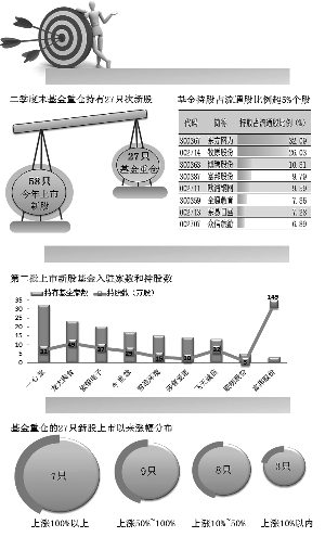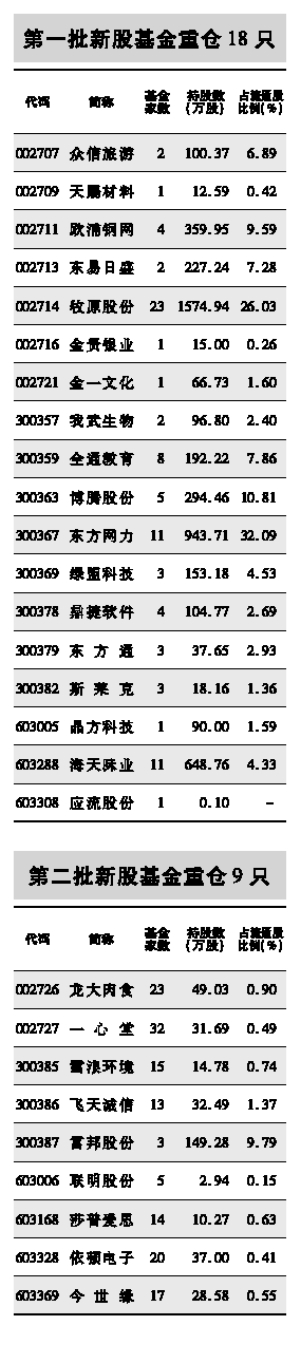 年内管理层控制了新股发行节奏,新股成为稀缺资源,上市即遭到热炒,巨大的赚钱效应自然也吸引着基金的注意。根据基金二季报,共有27只年内上市新股纳入基金重仓股范围。其中,有18只为第一批上市新股,第二批新股中有9只出现在基金重仓股名单。 (专题数据由证券时报中心数据库提供,数据来源于基金公司公告,若有出入,请以公告为准) 本版导读: