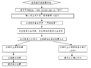 (上接B5版) 注:注册成功的网上用户名未被激活前,不能用来办理上市公司股东大会网络投票、证券查询等业务。自然人、境内法人和境外法人投资者须分别携带以下申请材料,到选定的身份验证机构办理身份验证: 1、自然人: (1)证券账户卡及复印件; (2)本人有效身份证明文件及复印件; 委托他人代办的,还需提交经公证的委托代办书、代办人的有效身份证明文件及复印件。 2、境内法人: (1)证券账户卡及复印件; (2)企业法人营业执照/注册登记证书及复印件,或加盖申请人公章的复印件; (3)法定代表人证明书、法定代表人授权委托书,以及法定代表人身份证明文件复印件; (4)经办人有效身份证明文件及复印件。 3、境外法人: (1)证券账户卡及复印件; (2)有效商业注册登记证明文件或与商业注册登记证明文件具有相同法律效力的可证明其机构设立的文件及复印件; (3)董事会或董事、主要股东或其他有权人士授权委托书,能证明该授权人有权授权的文件,以及授权人身份证明文件复印件; (4)经办人有效身份证明文件及复印件。 附件3: 投资者网络投票操作流程 投资者一次性办理身份验证并激活网上用户名后,即可参加今后各有关上市公司股东大会网络投票。投资者使用已激活的网上用户名、密码(电子证书用户还须使用电子证书),在有效时间内按以下流程进行网络投票: ■ 注1:使用电脑通过互联网登录中国结算网站后,点击首页右上角“登录”,电子证书用户选择‘证书用户登录’,非电子证书用户选择‘非证书用户登录’。 注2:电子证书用户还须使用电子证书;非电子证书用户还须使用验证码,验证码由系统自动产生,并显示在页面上。 咨询电话:4008-058-058