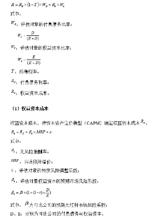■ 分析CAPM我们采用以下几步: 1)根据同花顺数据系统公布的最新5年期以上的、可以市场交易的、长期国债的实际收益率指标,加权平均收益率约为3.83%。 2)MRP的确定:正确地确定市场风险溢价是许多股票分析师和资产评估师的研究课题。在美国,Ibbotson Associates 的研究发现从1926 年到1997 年,股权投资年平均年复利回报率为11.00%,超过长期国债收益率(无风险收益率)约5.80%。这个超额收益率就被认为是市场风险溢价。借鉴美国相关部门估算风险溢价的思路,结合中国股票市场相关数据进行了研究,我们按如下方式计算中国的市场风险溢价: a.确定衡量股市整体变化的指数:目前国内沪、深两市有许多指数,我们选用的指数应该是能最好反映市场主流股票变化的指数,参照美国相关机构估算时选用标准普尔500(S&P500)指数的经验,我们在估算中国MRP时选用了沪深300指数。沪深300指数是2005年4月8日沪深交易所联合发布的第一只跨市场指数,该指数由沪深A股中规模大、流动性好、最具代表性的300只股票组成,以综合反映沪深A股市场整体表现。 b.收益率计算年期的选择:考虑到中国股市股票波动的特性,我们选择10年为间隔期为计算年期。 c.指数成分股的确定:沪深300指数的成分股每年是发生变化的,因此我们在估算时采用每年年底时沪深300指数的成分股。 d.数据的采集:借助同花顺资讯的数据系统提供所选择的各成分股每年年末的交易收盘价。由于成分股收益中应该包括每年分红、派息等产生的收益,需要考虑所谓分红、派息等产生的收益,为此我们选用的年末收盘价是同花顺数据中的年末“复权”价,价格中已经有效地将每年由于分红、派息等产生的收益反映在价格中。 e.无风险收益率的估算:选择每年年末距到期日剩余年限超过5年的国债收益率。 f.估算结论:经过计算,当前我们国内的市场风险溢价约为7.40%。 3)βe值 该系数是衡量北大之路相对于资本市场整体回报的风险溢价程度,也用来衡量个别股票受包括股市价格变动在内的整个经济环境影响程度的指标。由于北大之路目前为非上市公司,一般情况下难以直接对其测算出该系数指标值,故本次通过选定与北大之路处于同行业的上市公司于基准日的β系数(即βt)指标平均值作为参照。 同花顺资讯公司是一家从事于β的研究并给出计算β值的计算公式的公司。经查生物制药行业的可比公司加权剔除财务杠杆调整平均@=0.888。 选取的行业对比公司详见下表: ■ 资本结构参考可比上市公司资本结构的平均值作为被评估企业目标资本结构比率。 D根据基准日的有息负债确定,E根据基准日的每股收盘价格×股份总额确定。 经过计算,该行业的D/E=9.10%。 最后得到评估对象权益资本预期风险系数的估计值βe=0.956 4)特定风险ε的确定 a.本次评估考虑到北大之路的资产规模、融资条件、资本流动性以及公司的治理结构和公司资本债务结构等方面与可比上市公司的差异性所可能产生的特性个体风险,设公司特定个体风险调整系数ε=2.00%。 b.对于科兴,除上述因素外,考虑到未来手足口病疫苗尚存一定的不确定性,设公司特定个体风险调整系数ε=2.50%。 c.对于天津华立达,除上述因素外,考虑到未来经营团队发生变更,其盈利预测和历史年度数据相比有较大幅度的提高,评估基准日时尚处于亏损状态,未来盈利预测存在一定的不确定性,设公司特定个体风险调整系数ε=3.00%。 5)权益资本成本的确定 最终得到北大之路的权益资本成本Re: Re=3.83%+0.956×7.40%+2.0% =12.90% 同理可得出科兴生物和天津华立达的Re分别为13.20%和13.80%。 (2)债务资本成本 债务资本成本Rd取5年以上的贷款利率6.55%。 (3)资本结构的确定 结合企业未来盈利情况、管理层未来的筹资策略,确定上市公司资本结构为企业目标资本结构比率。
