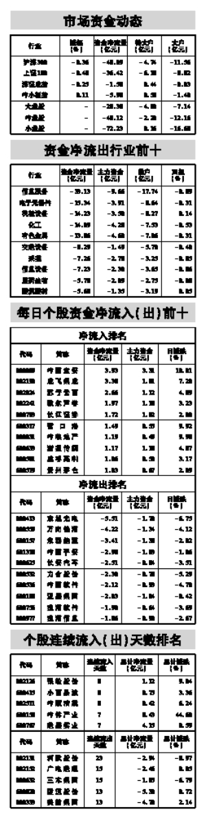 各类资金当日净流量对比 资金策市 Money Flow 据STCN资金流向快报(http://data.stcn.com/statisticalData.shtml)数据显示,8月20日,沪深两市共流出资金148.72亿元,连续第3个交易日净流出。其中,沪市净流出62.88亿元,深市净流出85.84亿元。主力资金合计流出42.02亿元。 指数方面,上证180指数成份股合计资金流出36.42亿元,深证成指成份股资金流出1.58亿元,沪深300指数成份股资金流出48.09亿元。以股本规模计,流通盘中大盘股资金流出28.38亿元,中盘股资金流出48.12亿元,小盘股资金流出72.23亿元。 行业方面,按照衍生申万一级行业分类计,有4个行业资金净流入,21个行业资金净流出。其中,食品饮料流入资金1.97亿,成为资金最关注的行业;信息服务流出资金33.13 亿,有较明显的资金出逃现象。 有色金属业已持续10个交易日净流出资金,共流出资金128.50亿,为行业连续流出天数榜第一。 银轮股份已持续8个交易日净流入资金,累计流入资金1.12亿,居个股连续流入天数榜首位。利欧股份已持续23个交易日净流出资金,累计流出资金2.94亿,为个股连续流出天数榜第一。 股指期货方面,IF1409合约收报2364.40点,微跌0.20%;成交66.69万手,持仓量减1989手,收报13.82万手。(黄舒欣) 3、私募上半年末持股市值203亿 九大行业持股市值超10亿 2、私募重仓股7月以来平均上涨16.78% 12只个股涨幅超50% 4、公布中报公司上半年净利润增14.16% 私募重仓股净利润同比略降 1、私募现身近三成个股前十大流通股东名单 二季度新进114股 私募大佬的投资动向一直是市场关注的焦点,随着上市公司半年报的密集披露,私募的持股情况逐步曝光。据统计,私募共现身291家公司前十大流通股东名单,从其持股环比变动看,私募二季度调仓的力度较大,持有的个股中,新进114家,增持77家,剔除110家,不过,这种大幅度的换股也取得明显的成效,7月以来私募重仓股平均上涨 16.78%,强于大盘七个百分点。另一方面来看,私募对持有公司的业绩关注度明显不足,其重仓股上半年净利润略降0.07%,而已公布中报公司净利润平均上涨14.16%。 (专题数据由证券时报中心数据库提供,数据来源于上市公司公告,若有出入,请以公告为准。) 本版导读: